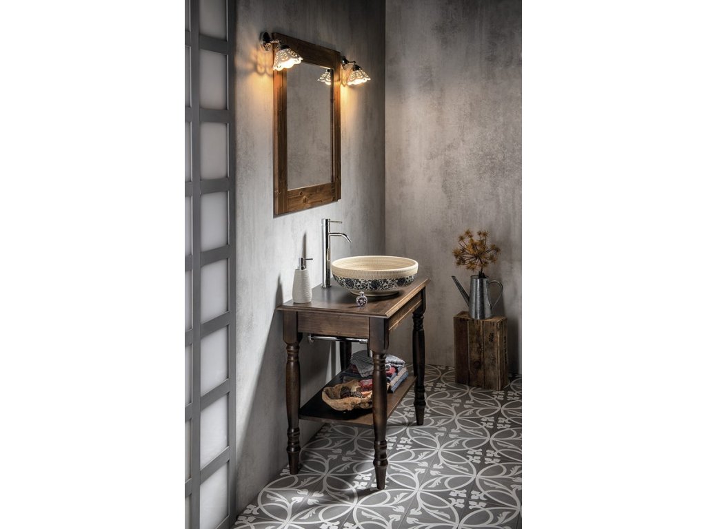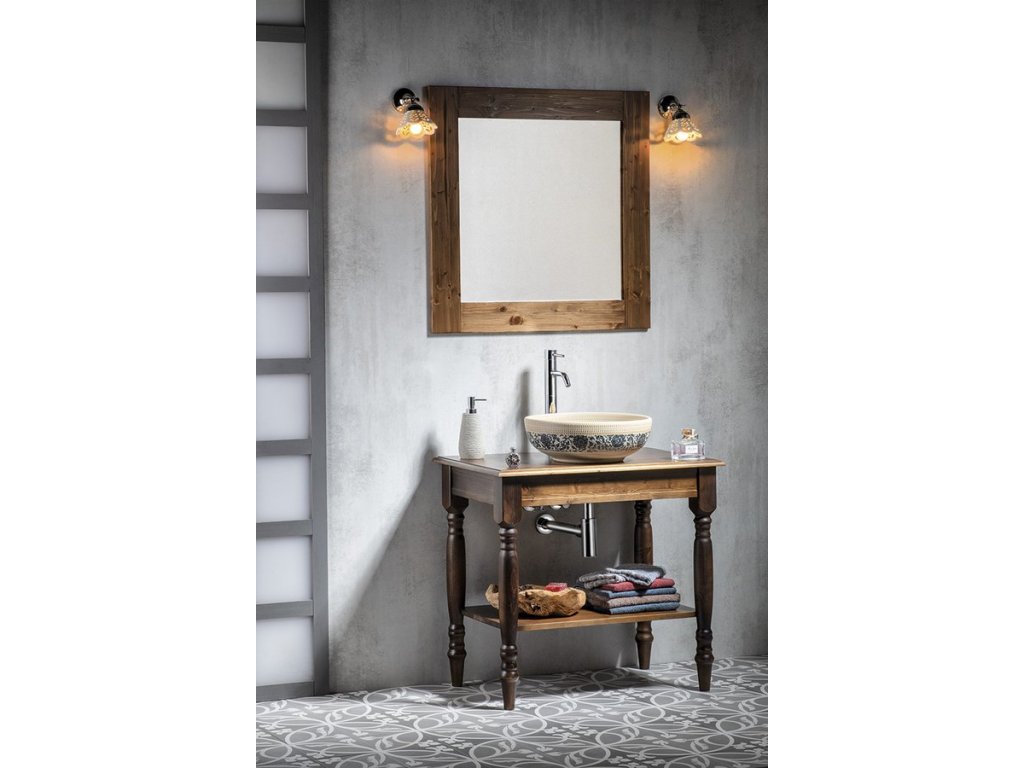Umyvadlové stolky CIMBURA v rustikálním stylu navodí atmosféru venkovského stavení. Stolky jsou vyrobené ze smrkového masivu, mají soustružené nohy a řemeslná zručnost se odráží i v desce s oble vyřezanou hranou.