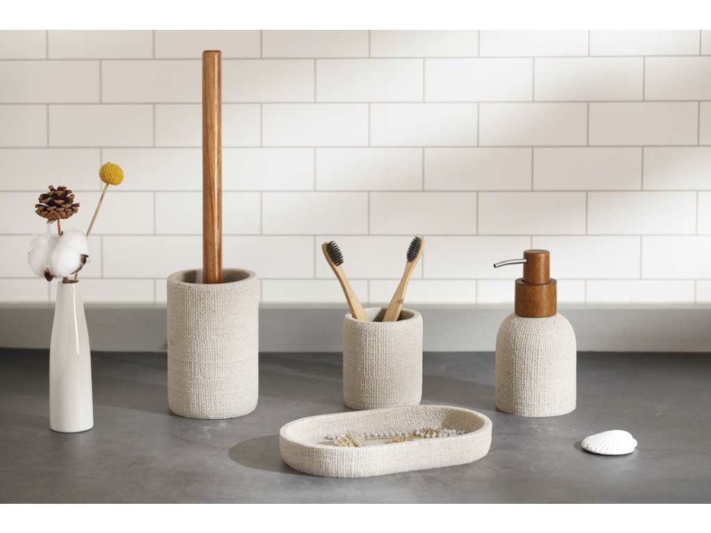 Doplňky CRAFT v decentním provedení kombinují texturu jutové tkaniny v béžovém a černém provedení s akáciovým dřevem. Vyjímat se budou v koupelně laděné do přírodního stylu. Mýdlenka nadstandardních rozměrů lze využít i jako miska na odkládání drobností a šperků.