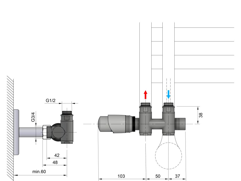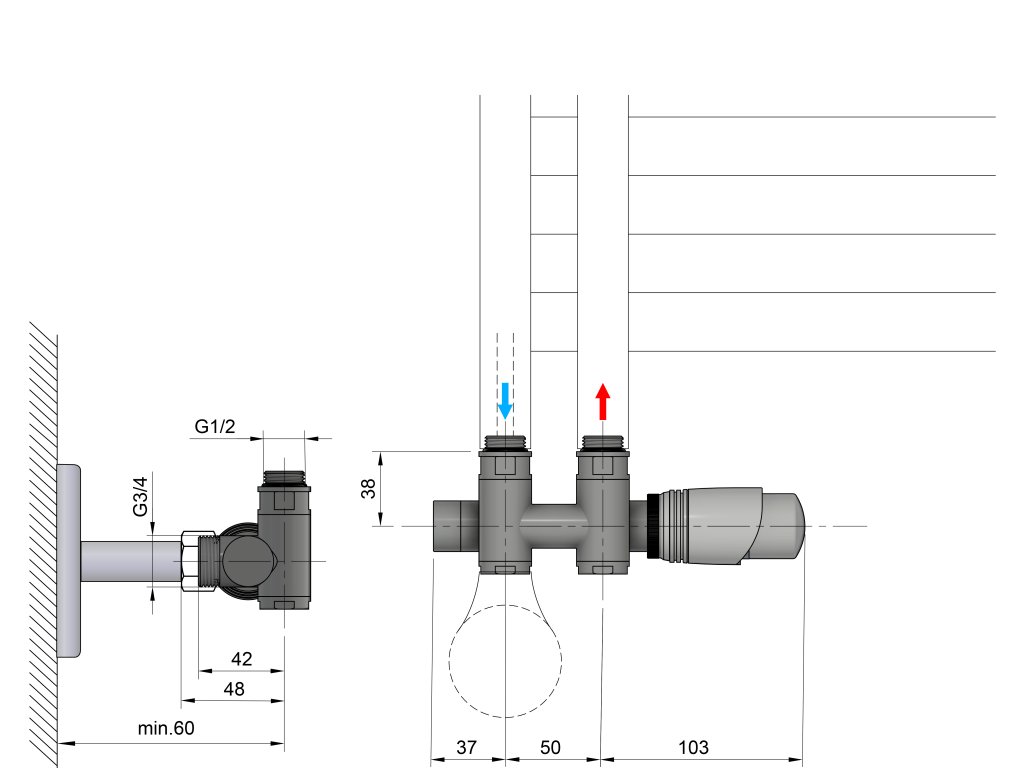 Radiátor je navržen pro středové připojení s roztečí 50 mm, což umožňuje čistou a estetickou instalaci bez viditelných bočních rozvodů. Součástí sady je termostatická připojovací sada, která umožňuje přesnou regulaci teploty a komfortní ovládání topného systému.