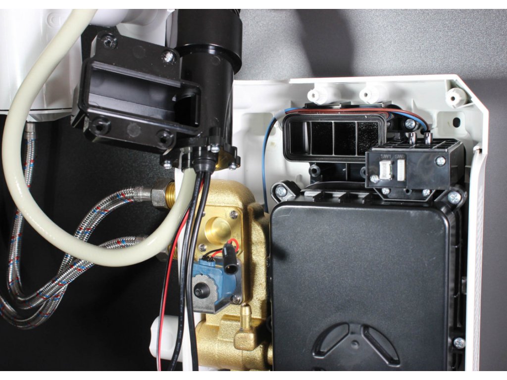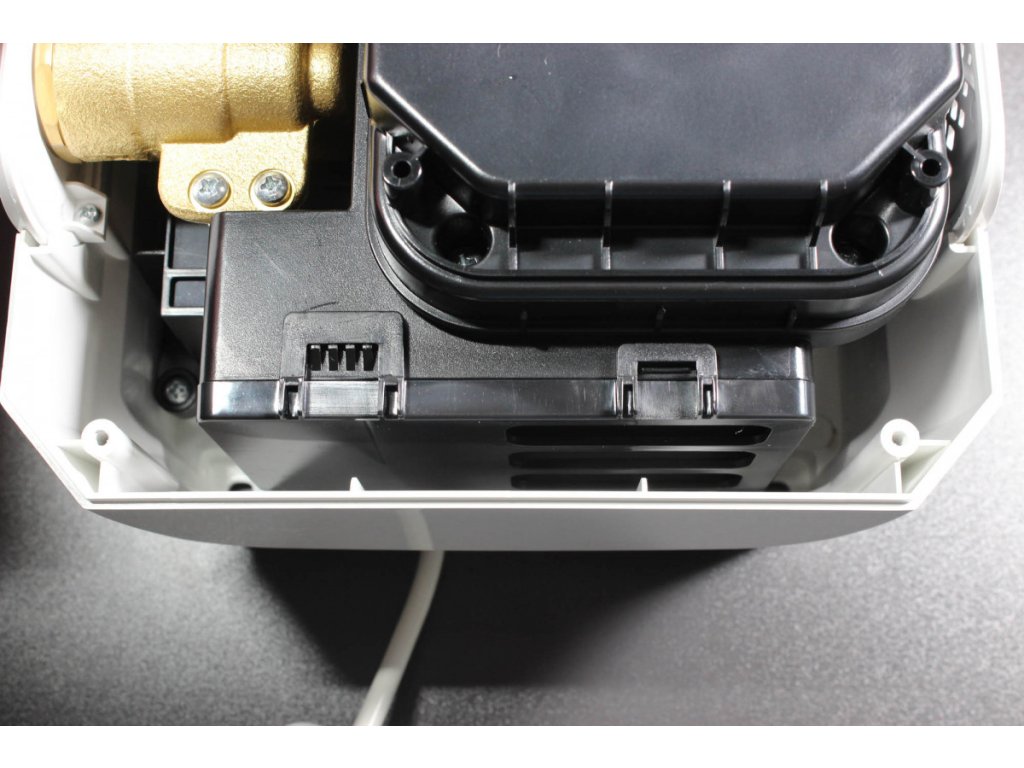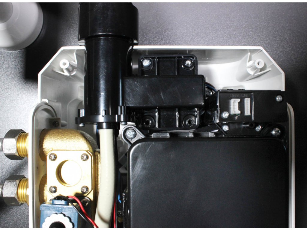 Přesnou teplotu vody z baterie zajišťuje zabudovaný termostatický směšovací ventil. Pomocí otočné hlavice regulace na levém boku motorové jednotky lze jednoduše nastavit požadovanou výstupní teplotu. S automatickým směšovacím ventilem je tak udržována konstantní teplota vody, bez ohledu na případné teplotní výkyvy ve vodovodním řádu.