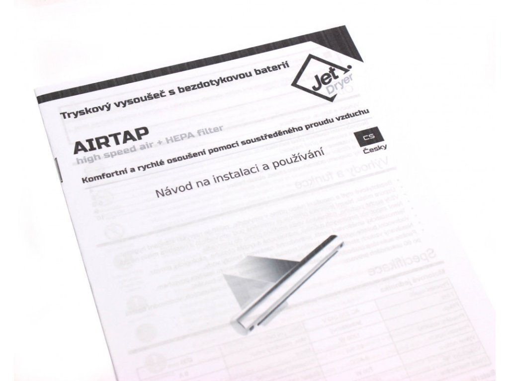 Vysoušeč Jet Dryer AIRTAP je kromě ochrany proti zkratu a přetížení vybaven také funkcí auto stop (zabudovaný časovač). V případě příliš dlouhého provozu se automaticky vypne. Vysoušení je vypnuto po 45 sekundách nepřetržitého provozu, vodovodní baterie po 60 sekundách provozu.