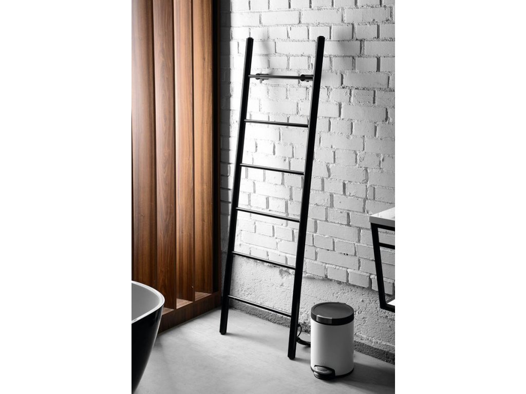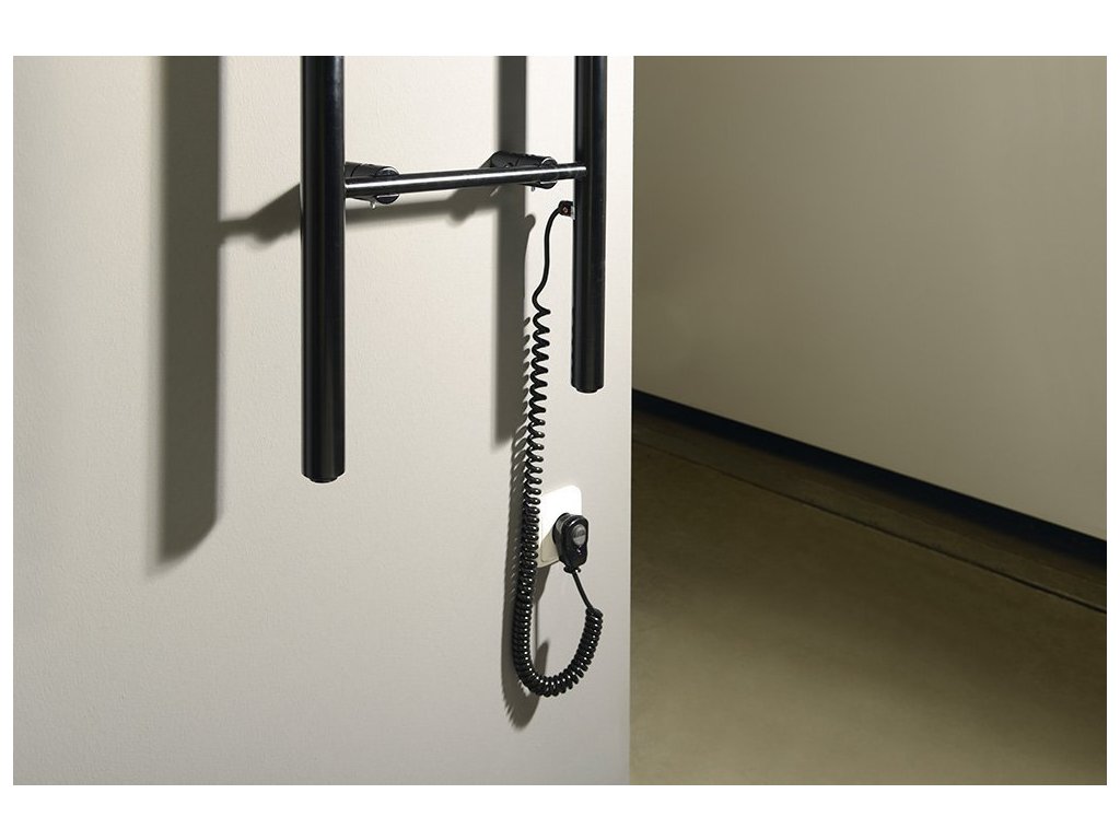 Elektrický sušák ručníků do moderního interiéru - v matně černé barvě jsou nejen trubky a uchycení, ale i napájecí kabel a elektrická zástrčka.