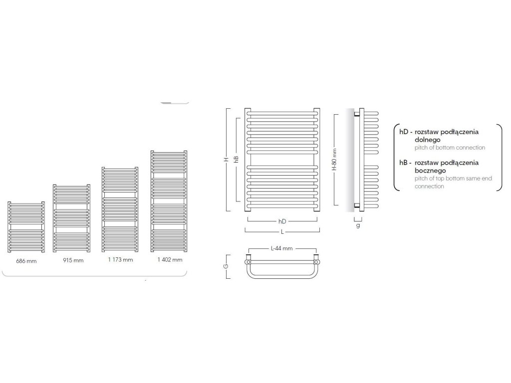 - 400 × 686 mm (spodní připojení, výkon 474 W (topná tyč 400 W)