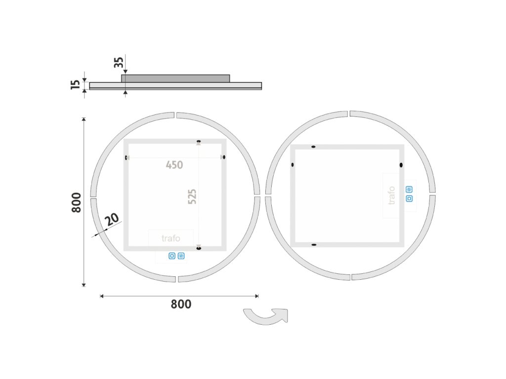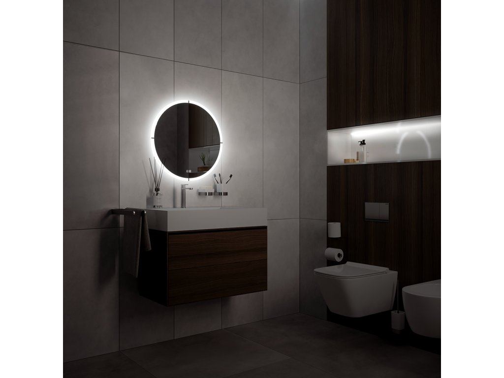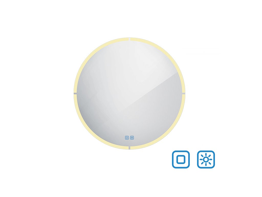 Kulaté bezrámové zrcadlo a s celoobvodovým podsvícením pro dokonalé a rovnoměrné osvětlení.Zrcadlo se ovládá dvěma dotykovými podsvícenými senzory, které umožňují změnu barvy podsvícení, nastavení intenzity osvětlení (stmívání) a disponují paměťovou funkcí pro uložení posledního nastavení. Kromě toho lze zrcadlo ovládat i pomocí nástěnného vypínače, což zvyšuje jeho flexibilitu a pohodlí použití.