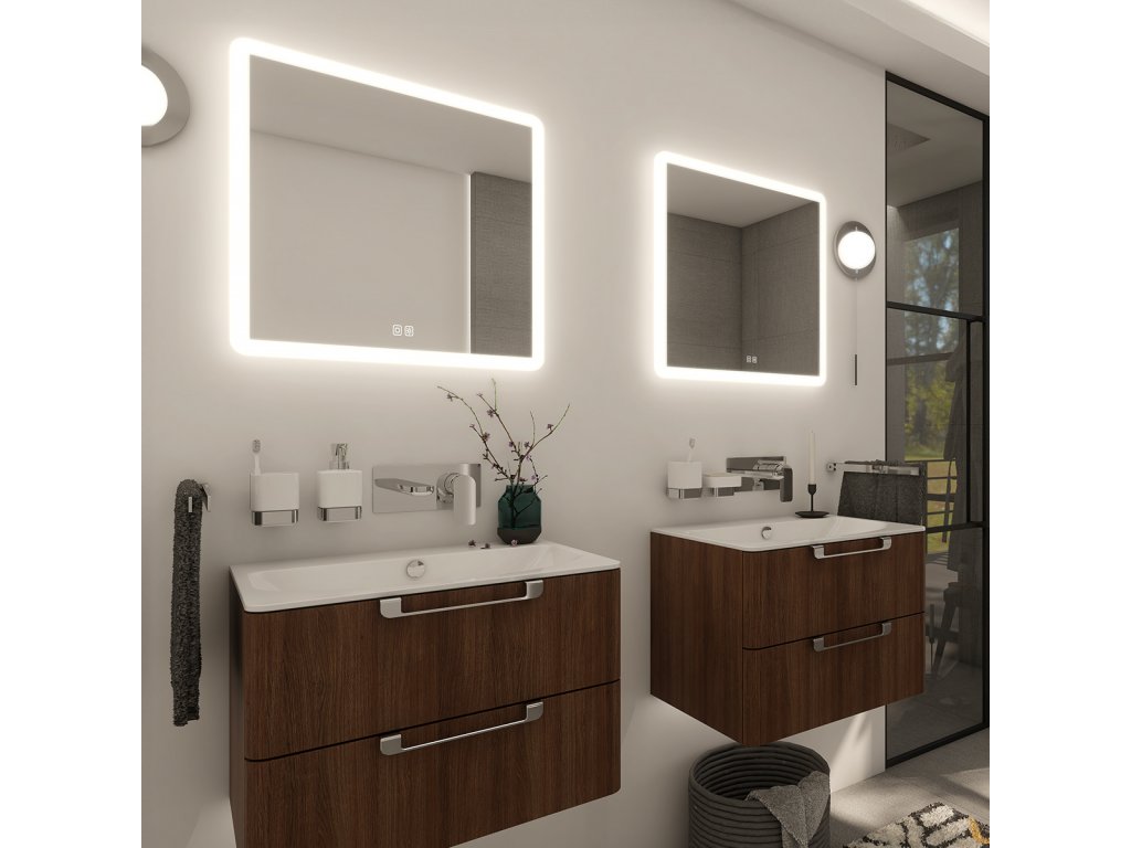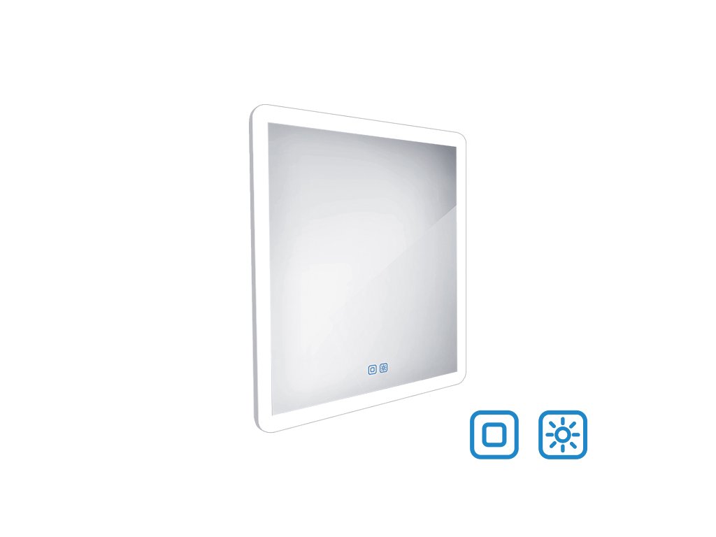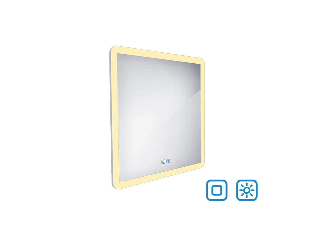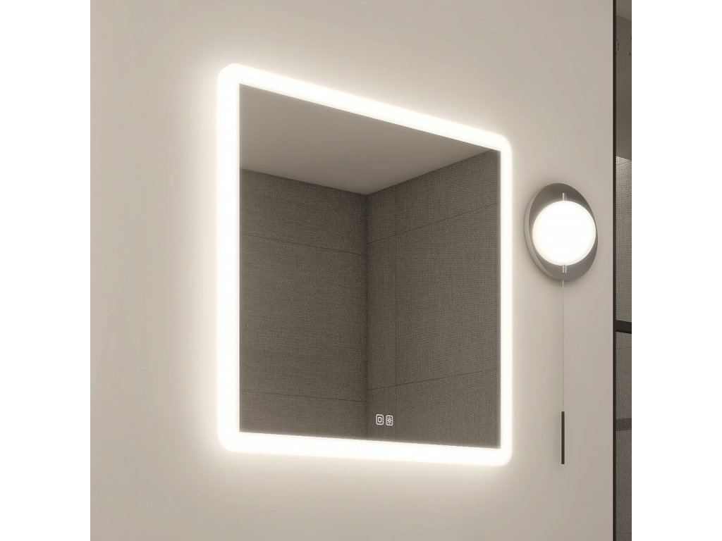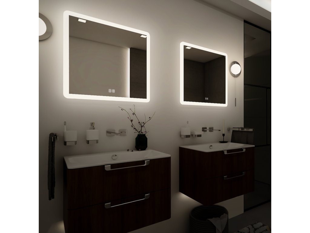 Čtvercové bezrámové zrcadlo s oblými rohy a celoobvodovým podsvícením pro dokonalé a rovnoměrné osvětlení.Zrcadlo se ovládá dvěma dotykovými podsvícenými senzory, které umožňují změnu barvy podsvícení, nastavení intenzity osvětlení (stmívání) a disponují paměťovou funkcí pro uložení posledního nastavení. Kromě toho lze zrcadlo ovládat i pomocí nástěnného vypínače, což zvyšuje jeho flexibilitu a pohodlí použití.