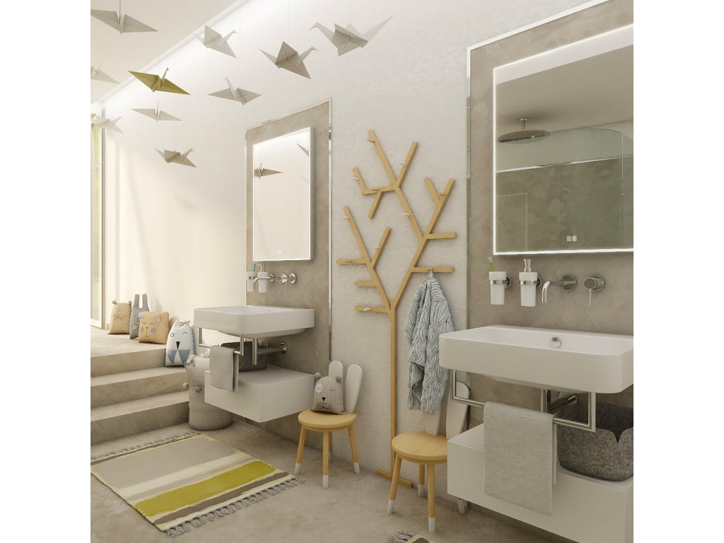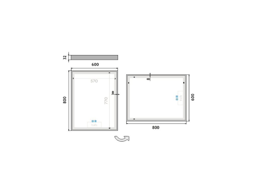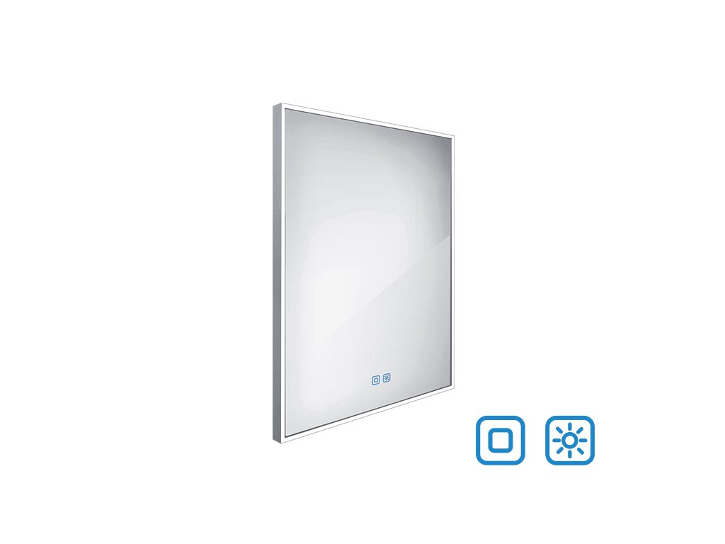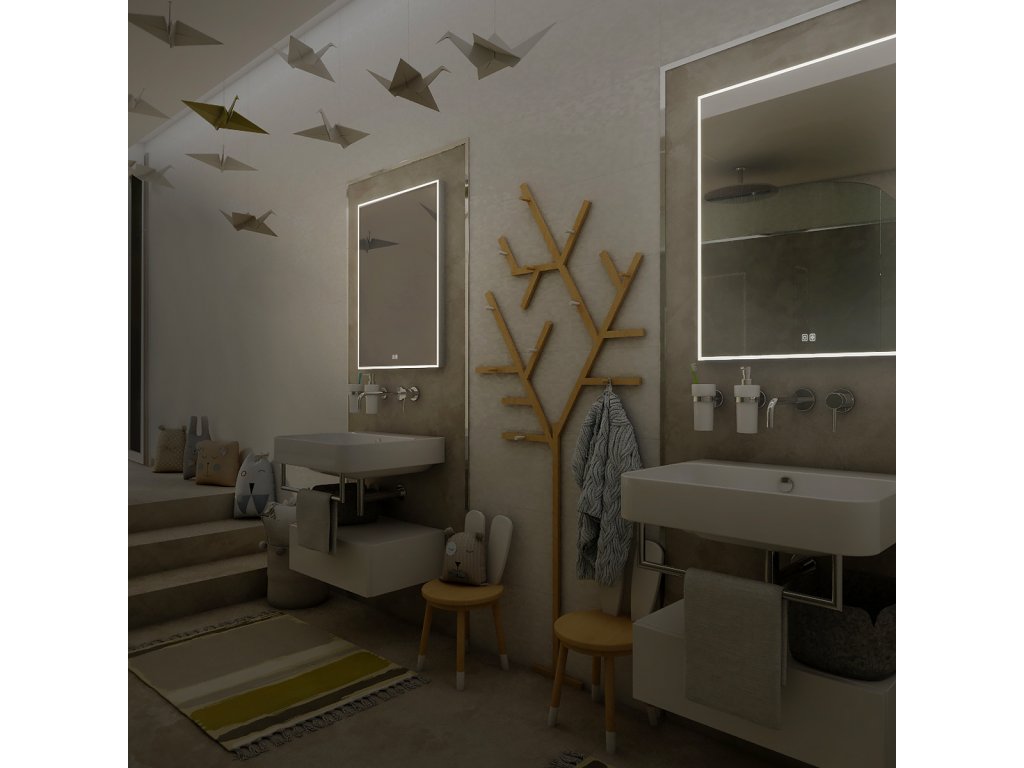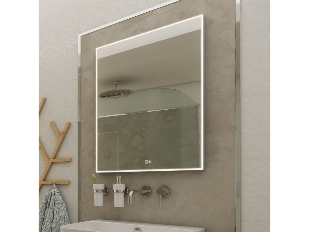 Obdélníkové zrcadlo s rámem s ostrými rohy a celoobvodovým svícením pro dokonalé a rovnoměrné osvětlení.Zrcadlo se ovládá dvěma dotykovými podsvícenými senzory, které umožňují změnu barvy světla, nastavení intenzity osvětlení (stmívání) a disponují paměťovou funkcí pro uložení posledního nastavení. Kromě toho lze zrcadlo ovládat i pomocí nástěnného vypínače, což zvyšuje jeho flexibilitu a pohodlí použití.