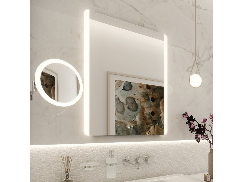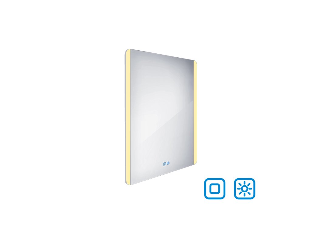 Obdélníkové bezrámové zrcadlo s oblými rohy a podsvícením ze stran pro moderní a elegantní vzhled.Zrcadlo se ovládá dvěma dotykovými podsvícenými senzory, které umožňují změnu barvy podsvícení, nastavení intenzity osvětlení (stmívání) a disponují paměťovou funkcí pro uložení posledního nastavení. Kromě toho lze zrcadlo ovládat i pomocí nástěnného vypínače, což zvyšuje jeho flexibilitu a pohodlí použití.