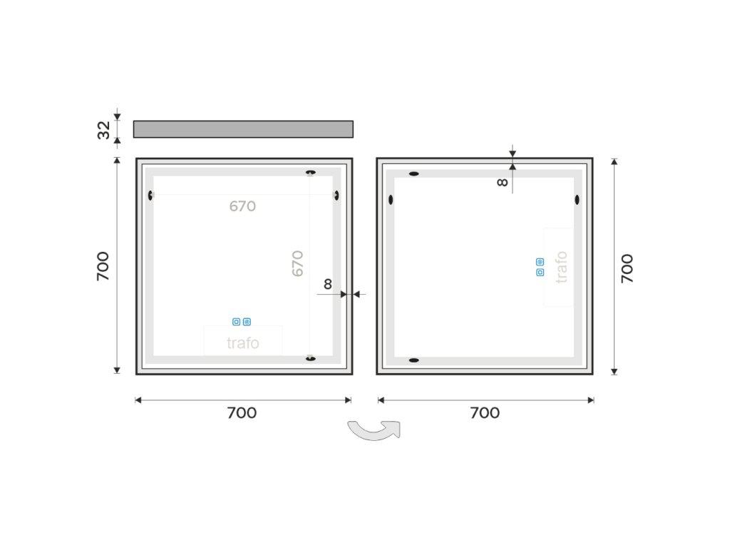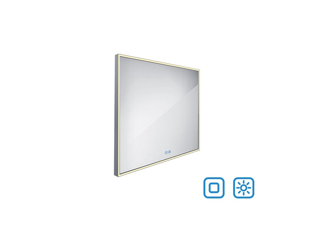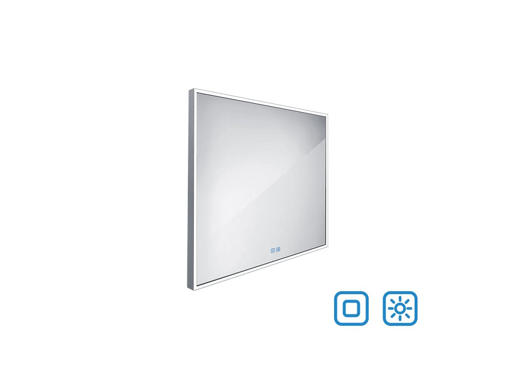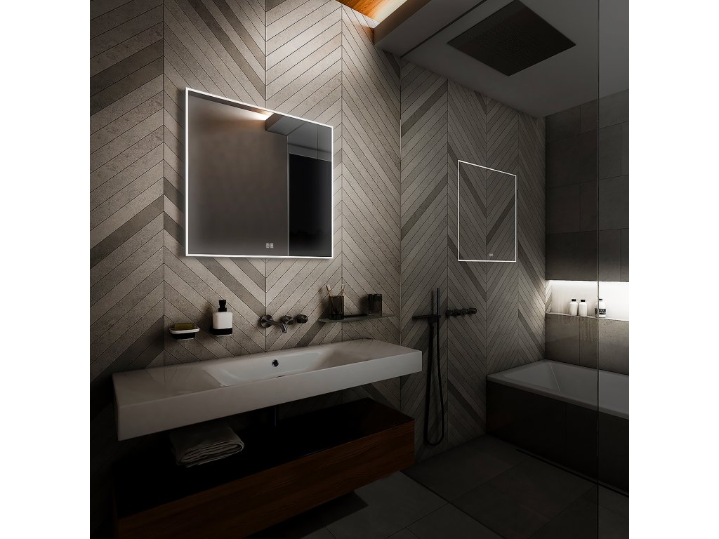 Čtvercové zrcadlo s rámem s ostrými rohy a celoobvodovým svícením pro dokonalé a rovnoměrné osvětlení.Zrcadlo se ovládá dvěma dotykovými podsvícenými senzory, které umožňují změnu barvy světla, nastavení intenzity osvětlení (stmívání) a disponují paměťovou funkcí pro uložení posledního nastavení. Kromě toho lze zrcadlo ovládat i pomocí nástěnného vypínače, což zvyšuje jeho flexibilitu a pohodlí použití.