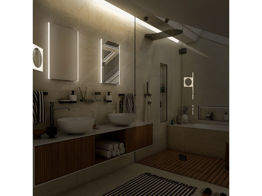 Zrcadlo do koupelny 90x70 s osvětlením je skvělým doplňkem do koupelny. Zrcadla do koupelny NIMCO vynikají kvalitním zpracováním a moderním designem. Zrcadlo je podsvíceno LED pásky ukrytými v PVC tubě (profil U 20x20 mm), která je umístěna pod vypískovanými bočními stranami zrcadla. Světlo neprochází pouze skrz sklo, ale vystupuje také z bočních stran zrcadla. Plně svítí 20 mm bočních stran zrcadla a vytváří tím zajímavý světelný efekt. Konstrukce je z hliníkového rámu 32x19 mm, sklo zrcadla o tloušťce 5 mm. Zrcadlo lze uchytit horizontálně a vertikálně. Připojení 220-240 V. Ochrana IP 44. Bez vypínače. Zapojení do el. rozvodu a zapínání přes vypínač světel v místnosti. LED čipy s vysokým výkonem. Barevná Teplota denní bílá – jasné polední světlo. Životnost LED diod je až 50 000 hodin.Koupelnové podsvícené LED zrcadlo