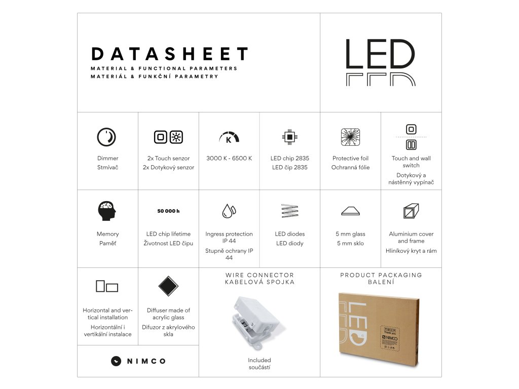 Zrcadlo do koupelny 90x70 cm s osvětlením nahoře a dole, dotykový spínač je skvělým doplňkem do koupelny. Zrcadla do koupelny NIMCO vynikají kvalitním zpracováním a moderním designem. Svícení za použití akrylátového skla plexiglass. Konstrukce je z hliníkového rámu 32x19 mm, sklo zrcadla o tloušťce 5 mm. Připojení 220-240 V. Zapínání / vypínání / ovládání dotykovým senzorem s pamětí. Možnost nastavení barevné teploty svícení a intenzity svítivosti. Životnost LED diod je až 50 000 hodin. Ochrana IP 44.Koupelnové podsvícené LED zrcadlo