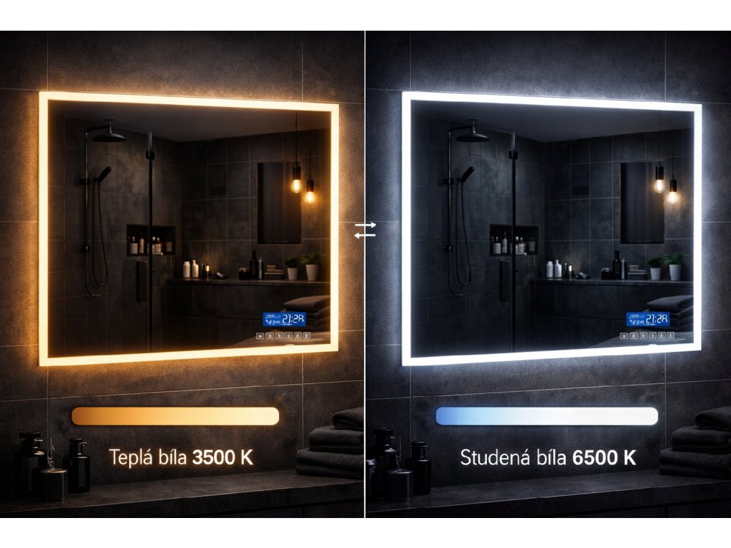 Zrcadlo je osazeno výkonným LED osvětlením s možností nastavení teploty barvy. Pomocí dotykového senzoru si snadno zvolíte od hřejivé teplé bílé (3000 K) pro relaxaci až po studenou bílou (6500 K) pro dokonalé líčení. Inteligentní paměť posledního nastavení zajistí, že se zrcadlo rozsvítí přesně tak, jak ho máte rádi.