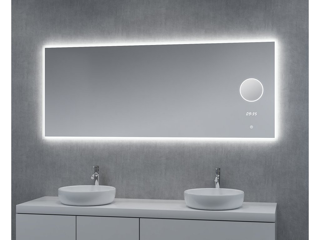 Moderní koupelnové zrcadlo 160 cm s LED osvětlením po celém obvodu zrcadla. Materiál zrcadla je zrcadlové sklo bez mědi s bezpečnostní fólií a rám zrcadla z eloxovaného hliníku....