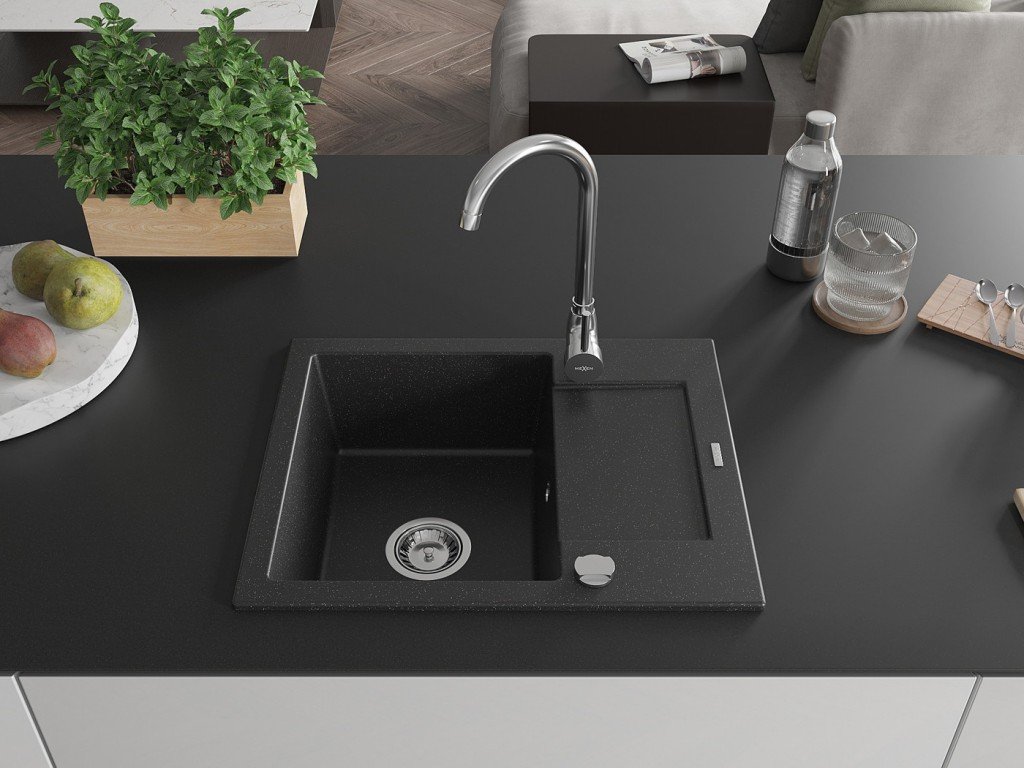 MEXEN - Enzo granitový dřez 1-mísa dřez s vypouštěním krátký odkapávač 576x465 mm, černá / stříbrná metalíza 6506571005-73