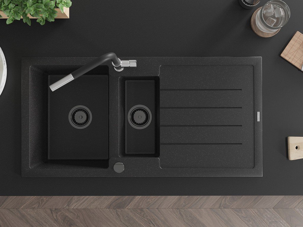 MEXEN/S - Andres granitový dřez s odkapávačem včetně baterie Flora, černá/stříbrná 6515-73-670401-07-B