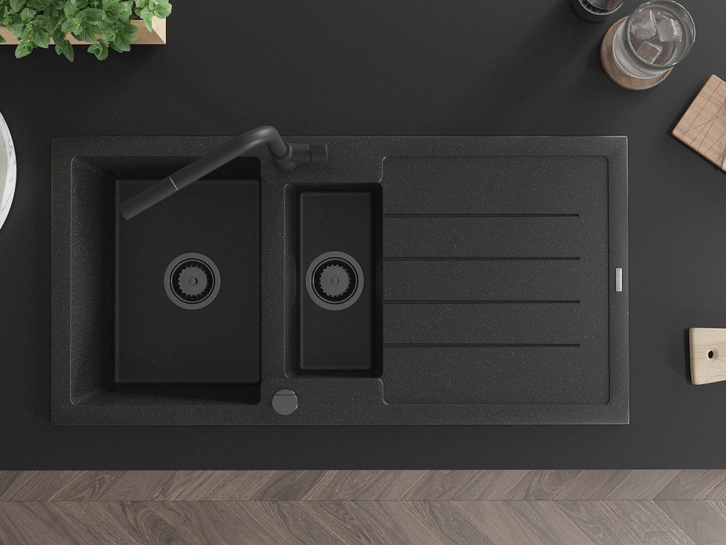 MEXEN/S - Andres granitový dřez s odkapávačem včetně baterie Flora, černá/stříbrná 6515-73-670401-70-B