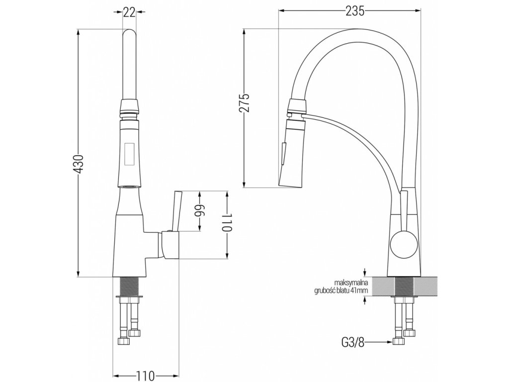 Kuchyňská baterie ke dřezu s flexibilním a ohebným černým ramínkem. Pákové ovládání a kombinace lesklého chromu se černého silikonu.