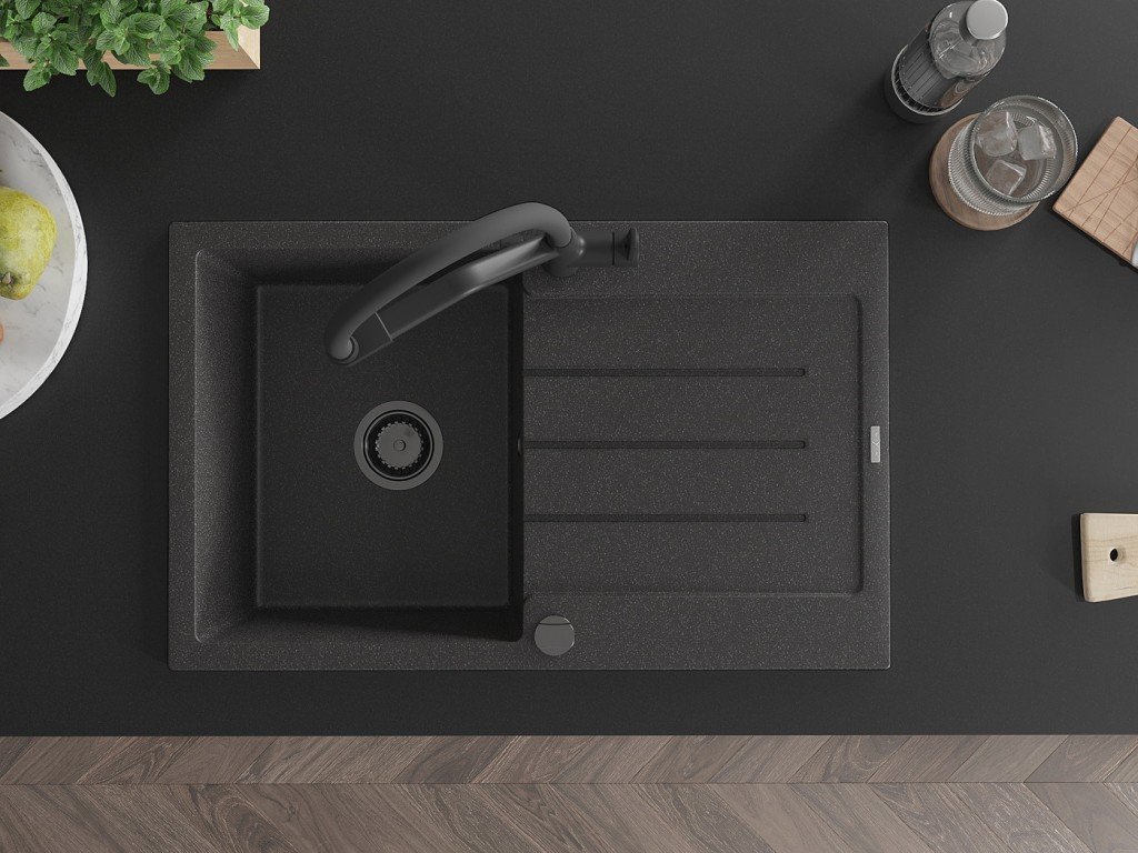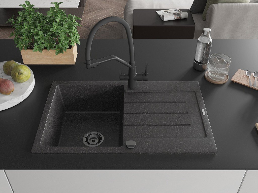Luxusní granitový dřez Aquasanita Helika Tesa 780.0E v odstínu black metallic kombinuje moderní design s vysokou odolností proti poškrábání, vysokým teplotám i chemikáliím....