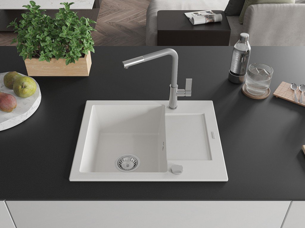 MEXEN/S - Enzo granitový dřez 1-miska s odkapávačem včetně baterie Flora, bílá 6506-20-670401-06