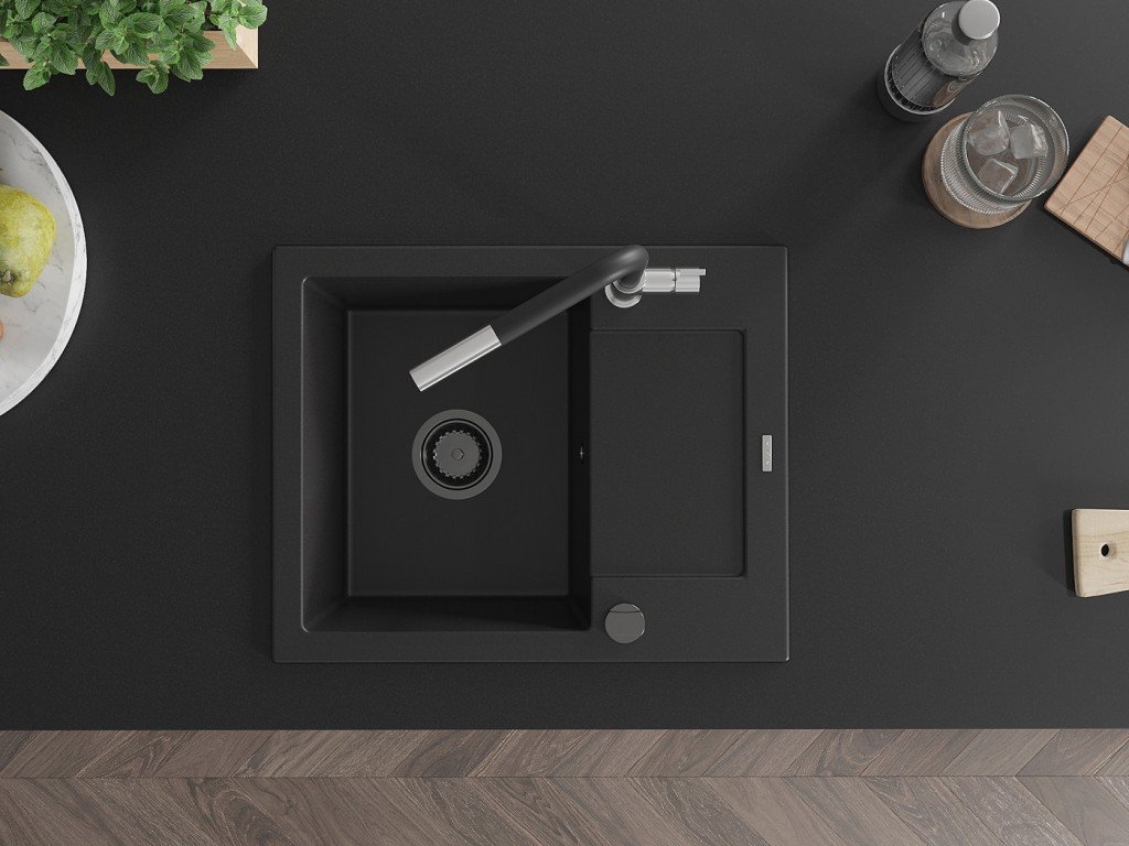 MEXEN/S - Enzo granitový dřez 1-miska s odkapávačem včetně baterie Flora, černá 6506-77-670401-07-B
