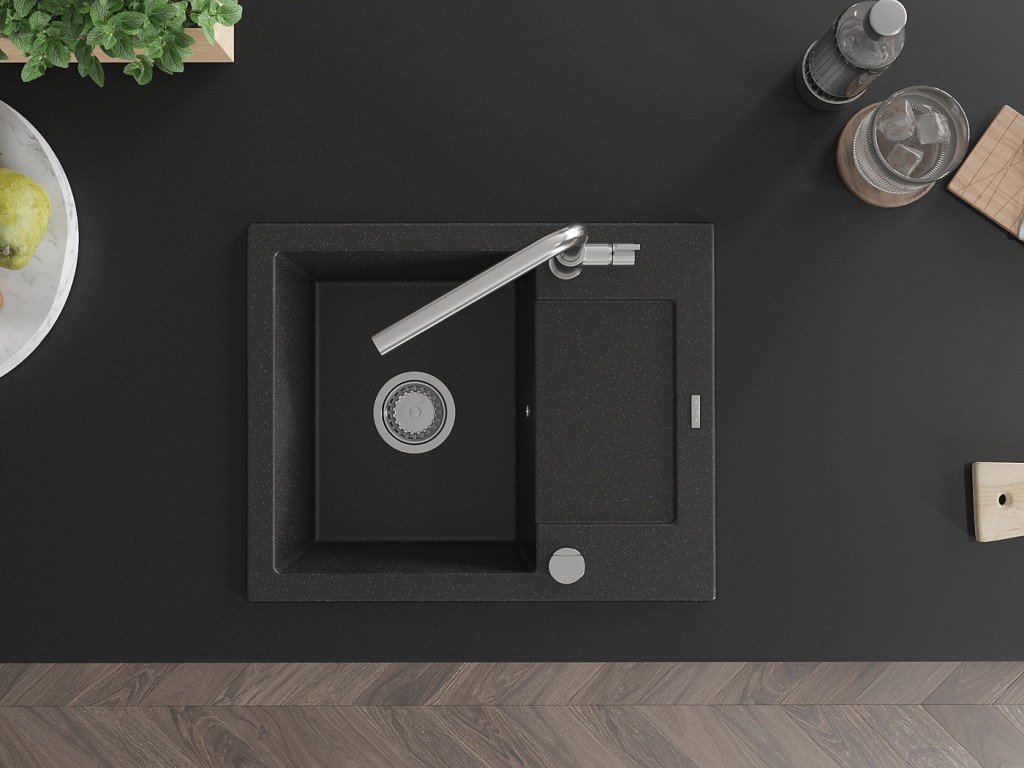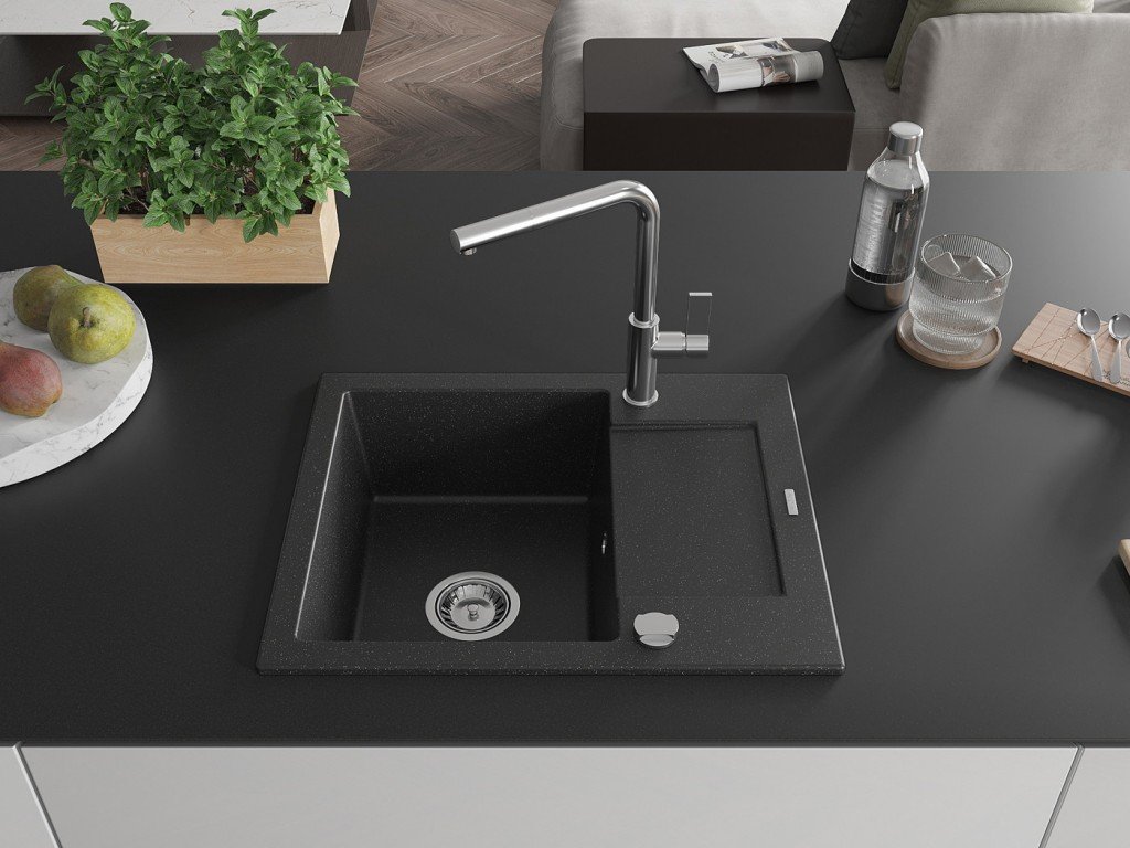 MEXEN/S - Enzo granitový dřez 1-miska s odkapávačem včetně baterie Flora, černá/stříbrná metalik 6506-73-670401-00