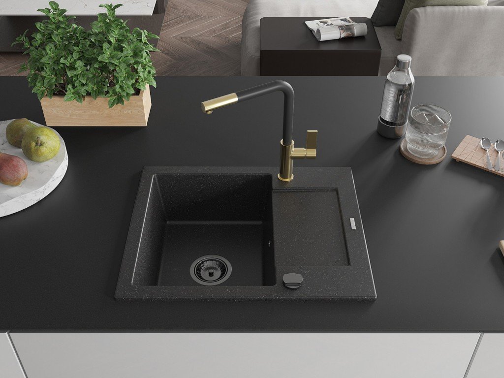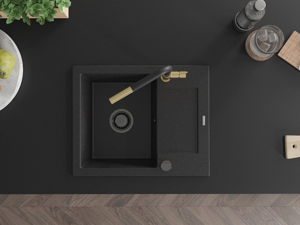 MEXEN/S - Enzo granitový dřez 1-miska s odkapávačem včetně baterie Flora, černá/stříbrná metalik 6506-73-670401-57-B + slevový kód