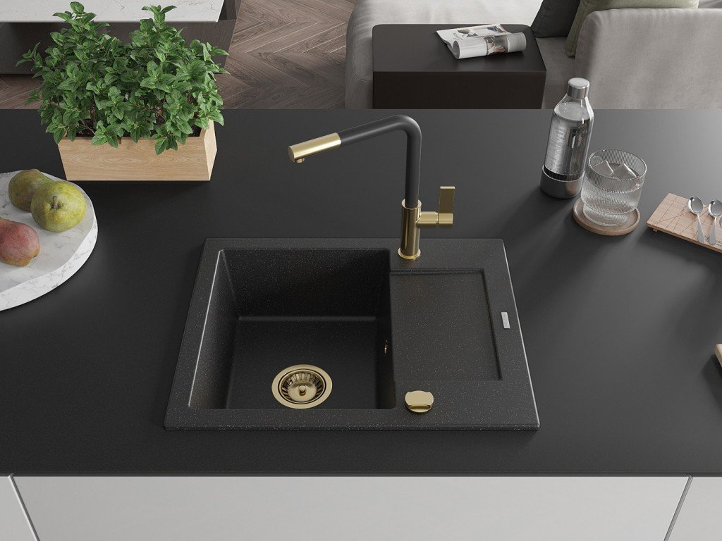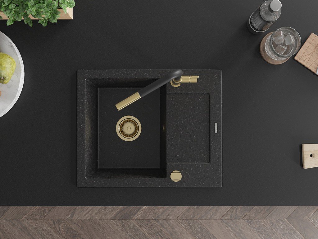 MEXEN/S - Enzo granitový dřez 1-miska s odkapávačem včetně baterie Flora, černá/stříbrná metalik 6506-73-670401-57-G + slevový kód
