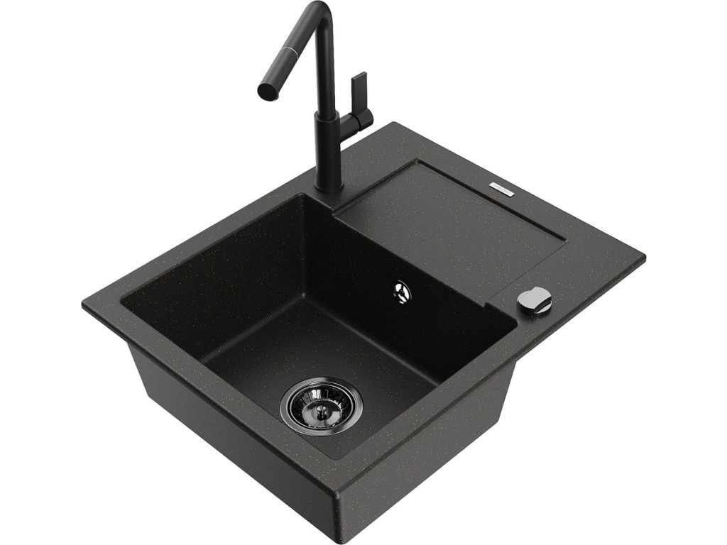 MEXEN/S - Enzo granitový dřez 1-miska s odkapávačem včetně baterie Flora, černá/zlatá metalik 6506-75-670401-70-B + slevový kód