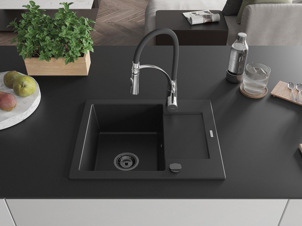 MEXEN/S - Enzo granitový dřez 1 s odkapávačem včetně baterie Aster, černá 6506-77-73450-07-B