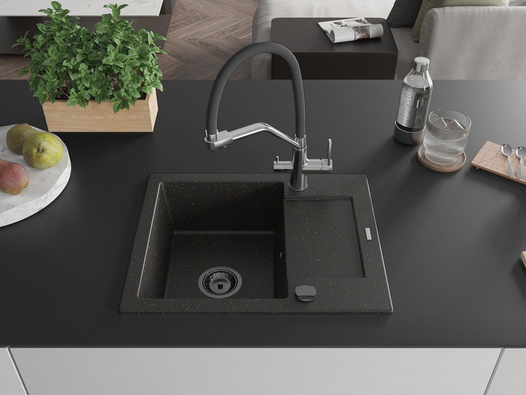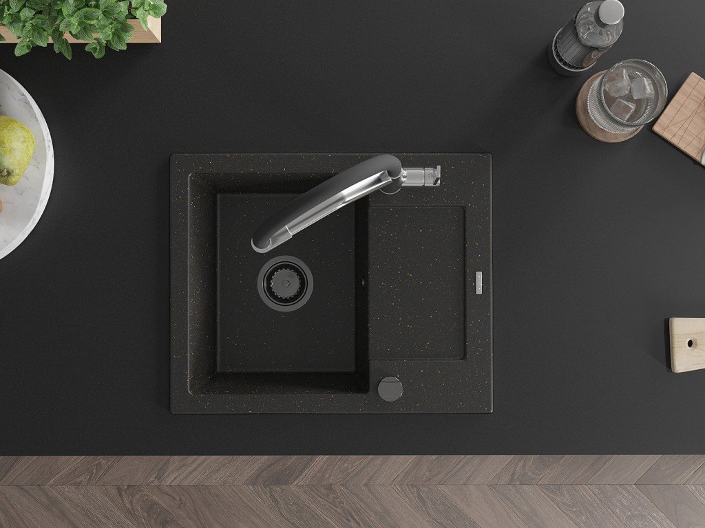 MEXEN/S - Enzo granitový dřez s odkapávačem včetně baterie Duo, černá/zlatá metalik 6506-75-671701-07-B + slevový kód