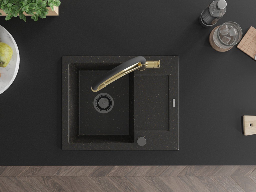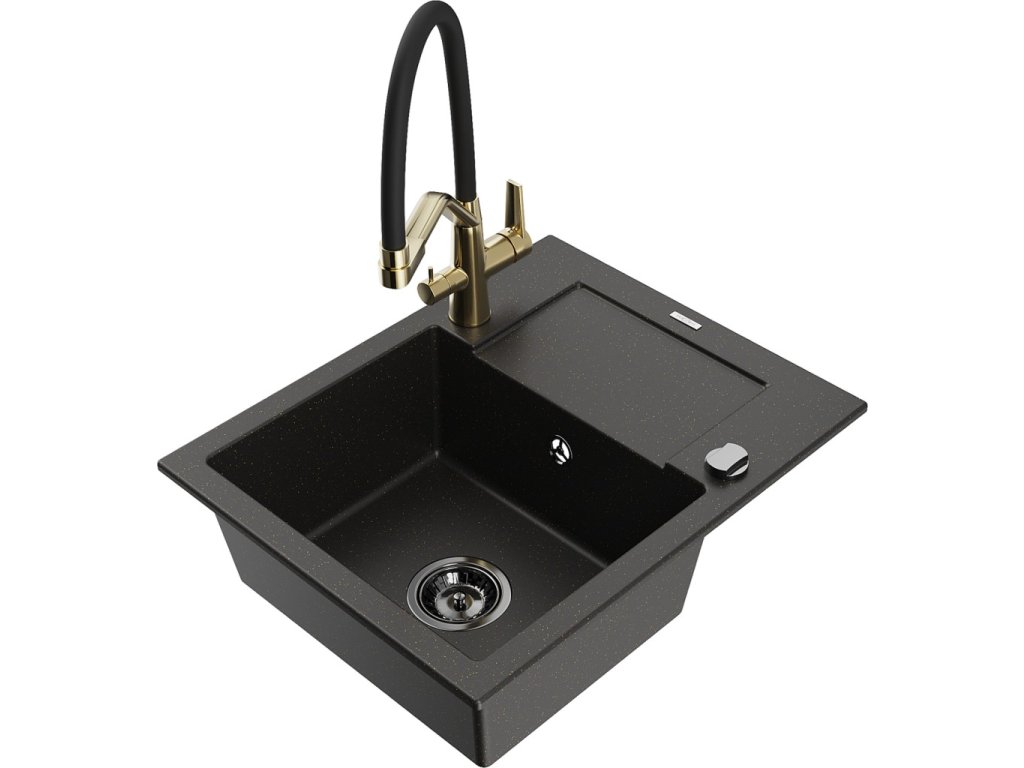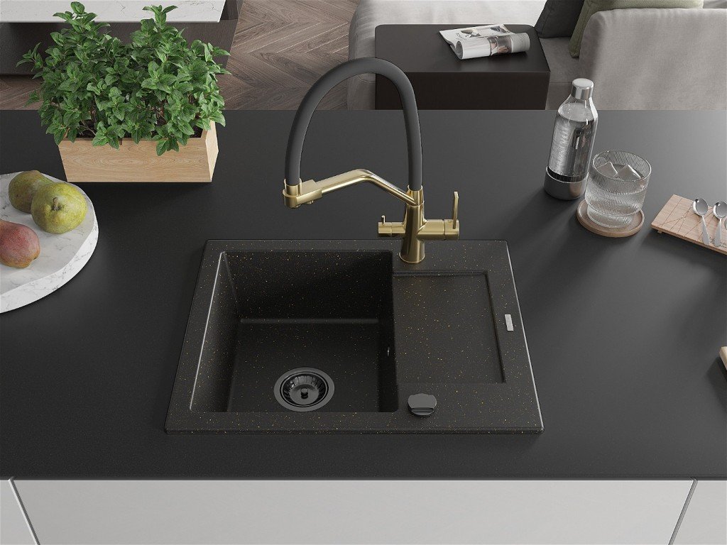 MEXEN/S - Enzo granitový dřez s odkapávačem včetně baterie Duo, černá/zlatá metalik 6506-75-671701-57-B + slevový kód