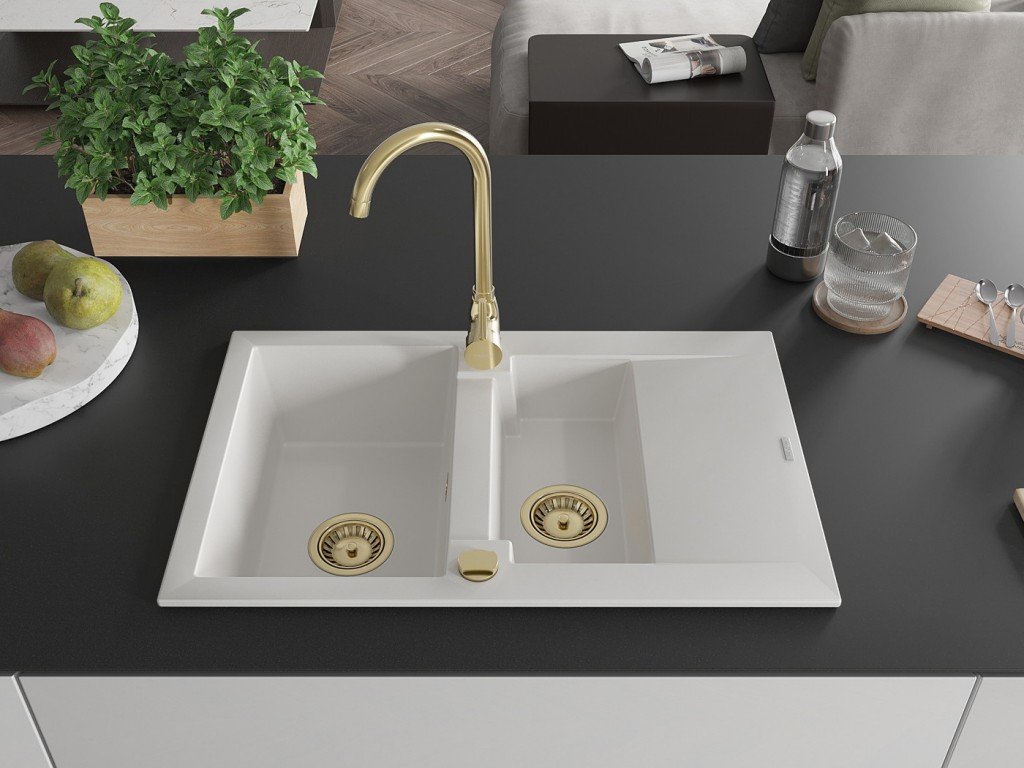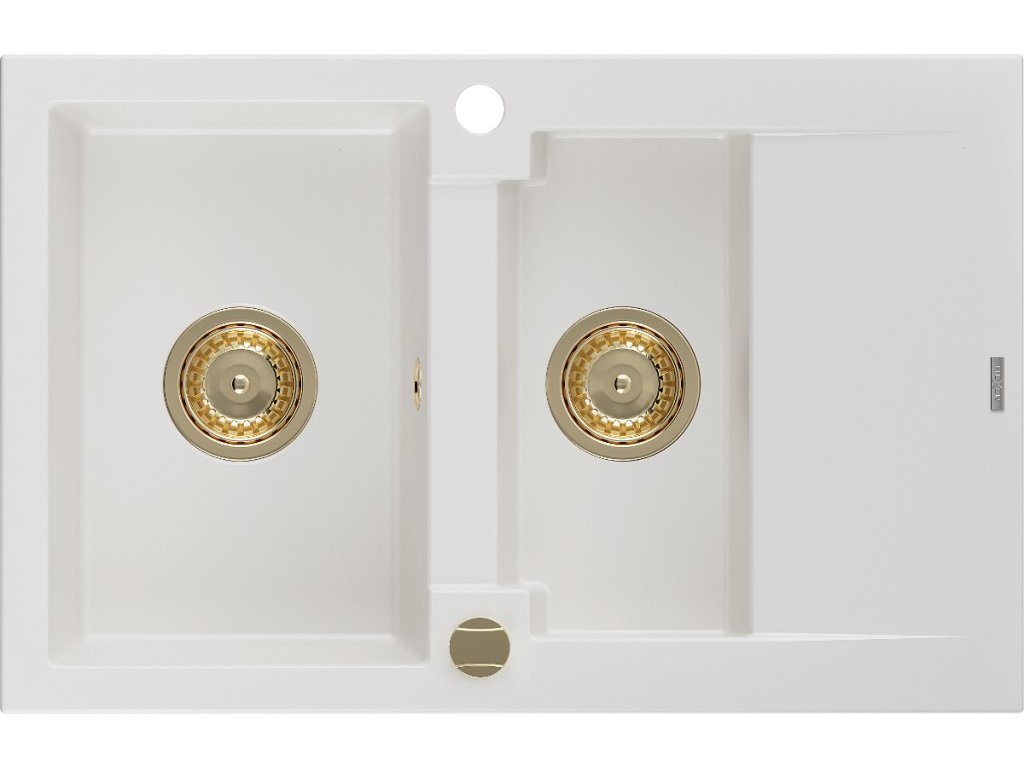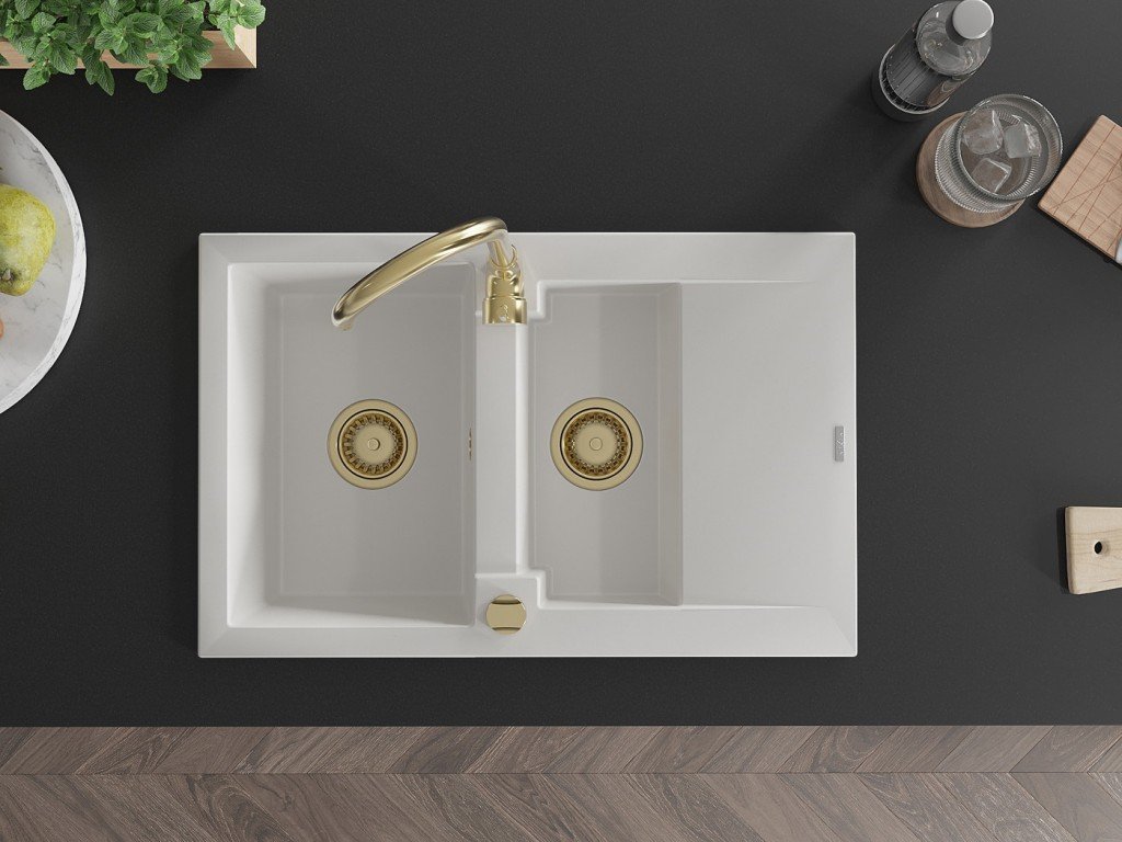 MEXEN/S - Gaspar granitový dřez 1.5 s odkapávačem 737 x 475 mm, bílá, zlatý sifon 6507731505-20-G