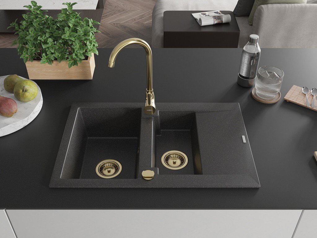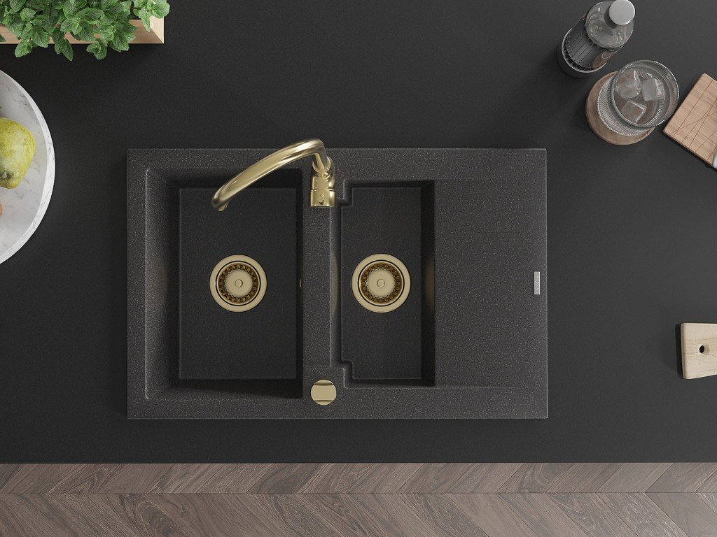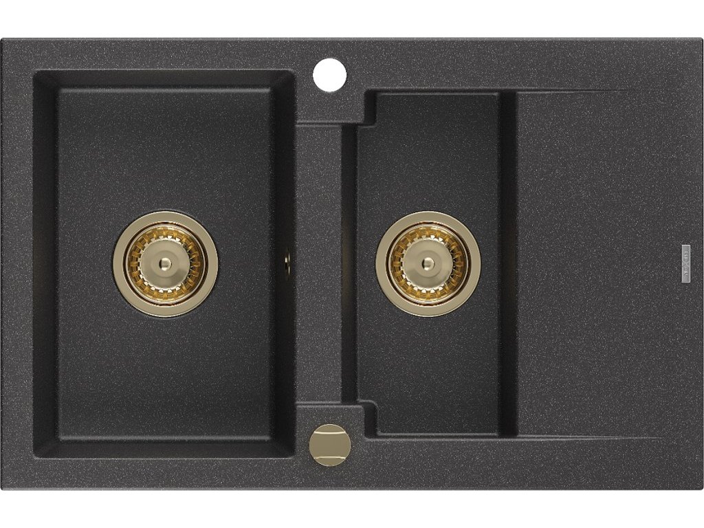 MEXEN/S - Gaspar granitový dřez 1.5 s odkapávačem 737 x 475 mm, černý kropenatý, zlatý sifon 6507731505-76-G