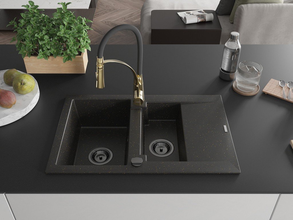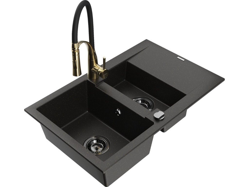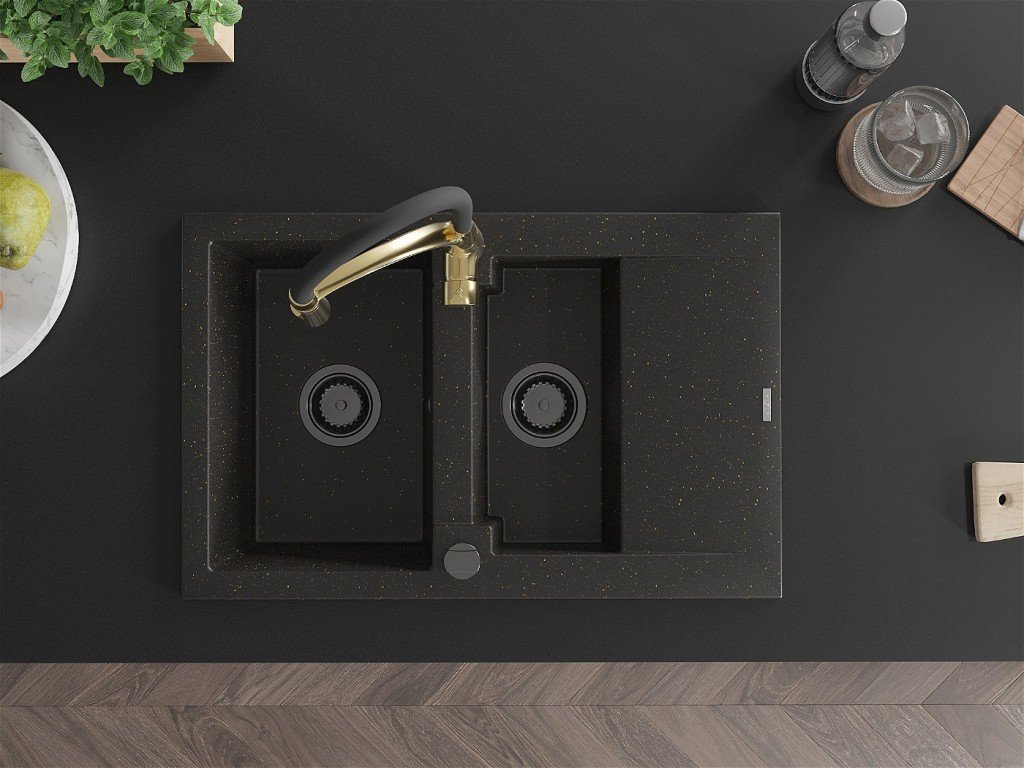 MEXEN/S - Gaspar granitový dřez 1.5 s odkapávačem včetně baterie Aster, černá/zlatá metalik 6507-75-73450-57-B + slevový kód
