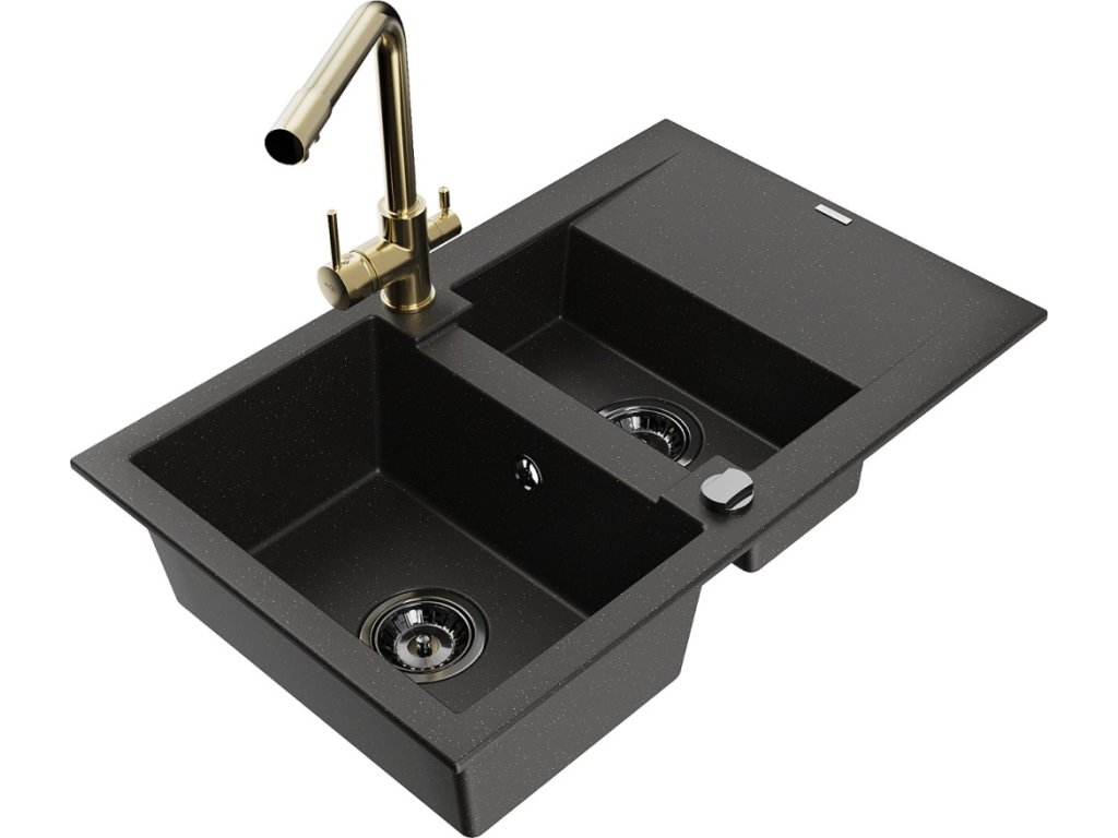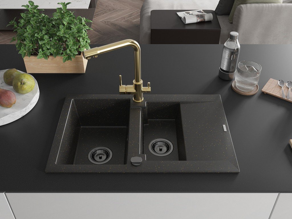 MEXEN/S - Gaspar granitový dřez 1.5 s odkapávačem včetně baterie Duero, černá/zlatá 6507-75-671600-50-B + slevový kód