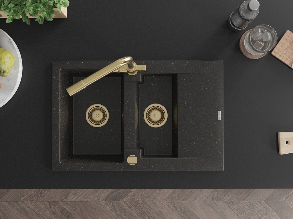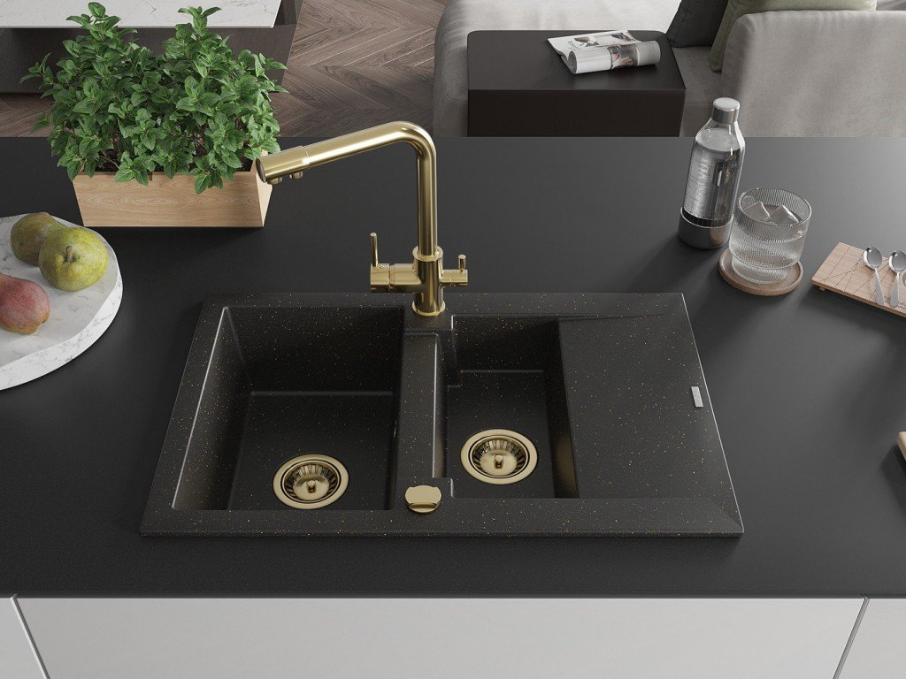 MEXEN/S - Gaspar granitový dřez 1.5 s odkapávačem včetně baterie Duero, černá/zlatá metalik 6507-75-671600-50 + slevový kód