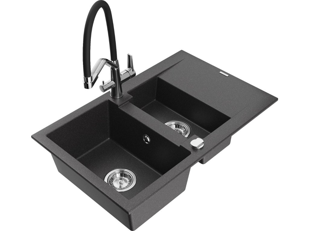 Granitový vestavný dřez s odkapem 77x44 cm v černé barvě kombinuje moderní design a vysokou odolnost. Vyroben z kvalitního granitového kompozitu, který odolává poškrábání,...
