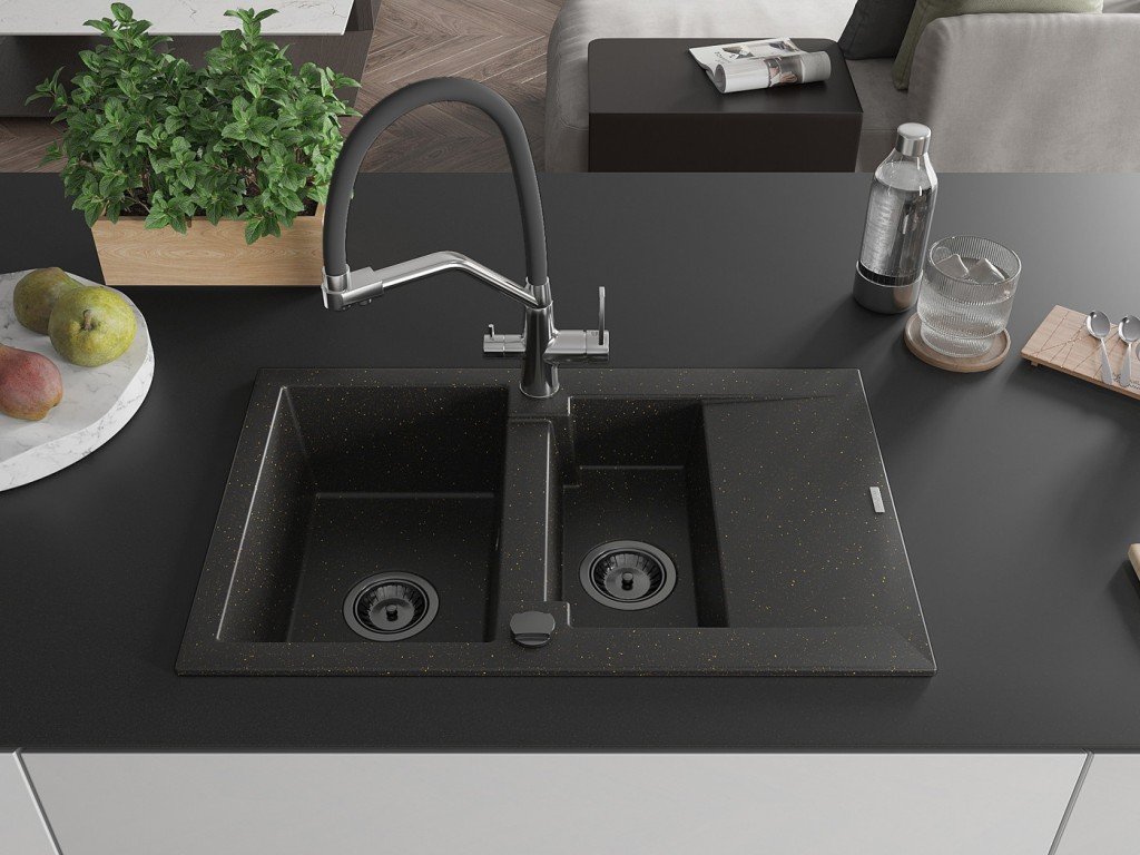Granitový vestavný dřez s odkapem 77x44 cm v černé barvě kombinuje moderní design a vysokou odolnost. Vyroben z kvalitního granitového kompozitu, který odolává poškrábání,...