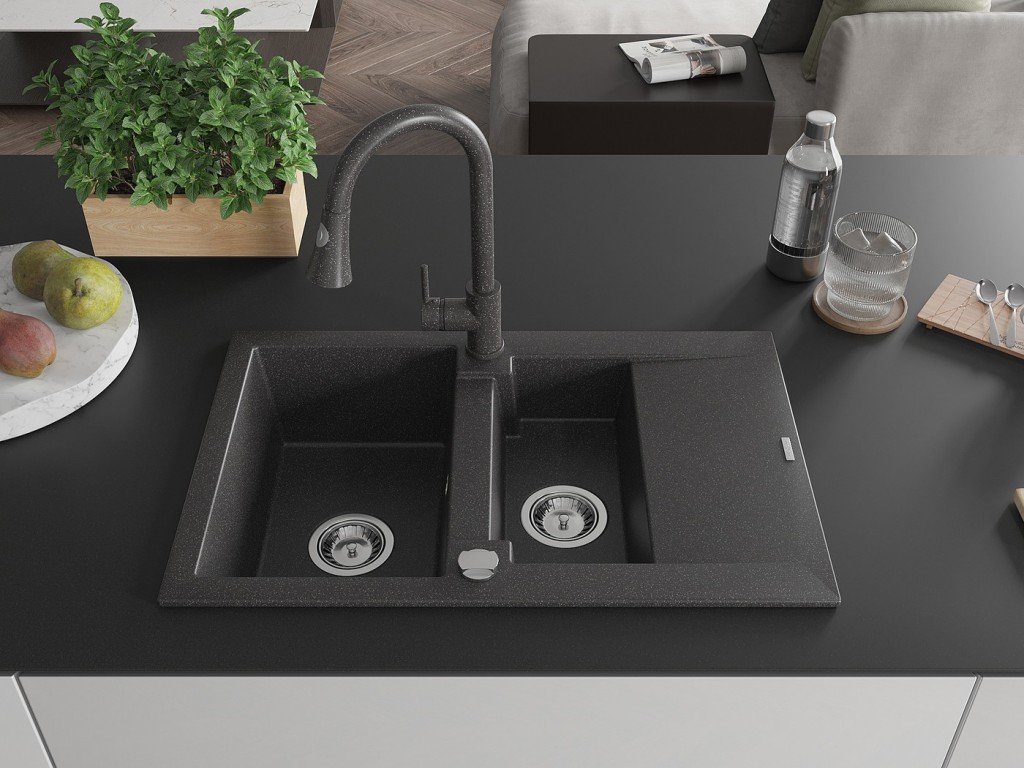 Granitový vestavný dřez s odkapem 77x44 cm v černé barvě kombinuje moderní design a vysokou odolnost. Vyroben z kvalitního granitového kompozitu, který odolává poškrábání,...