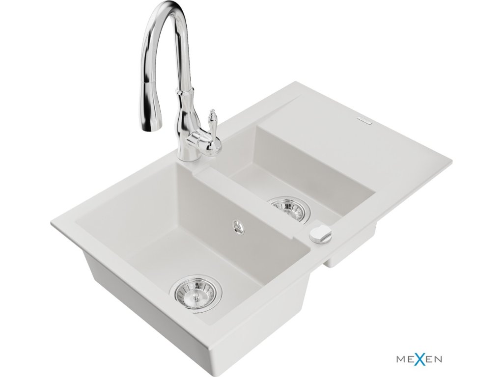 MEXEN/S - Matias granitový dřez 1.5 s odkapávačem včetně baterie Telma, bílá 6502-20-670200-50 je zlatým středem mezi funkčností a designem. Tento elegantní dřez je vyroben z...