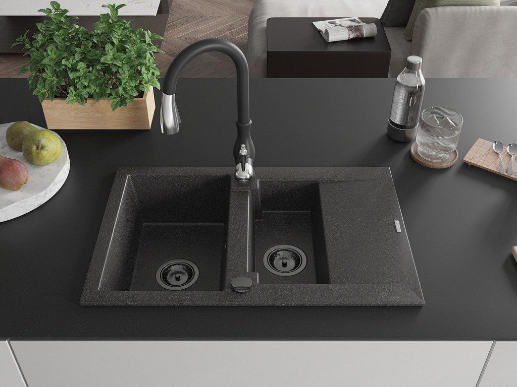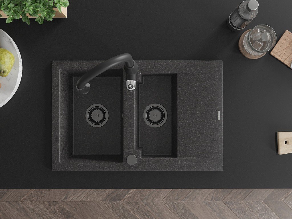 Granitový vestavný dřez s odkapem 77x44 cm v černé barvě kombinuje moderní design a vysokou odolnost. Vyroben z kvalitního granitového kompozitu, který odolává poškrábání,...