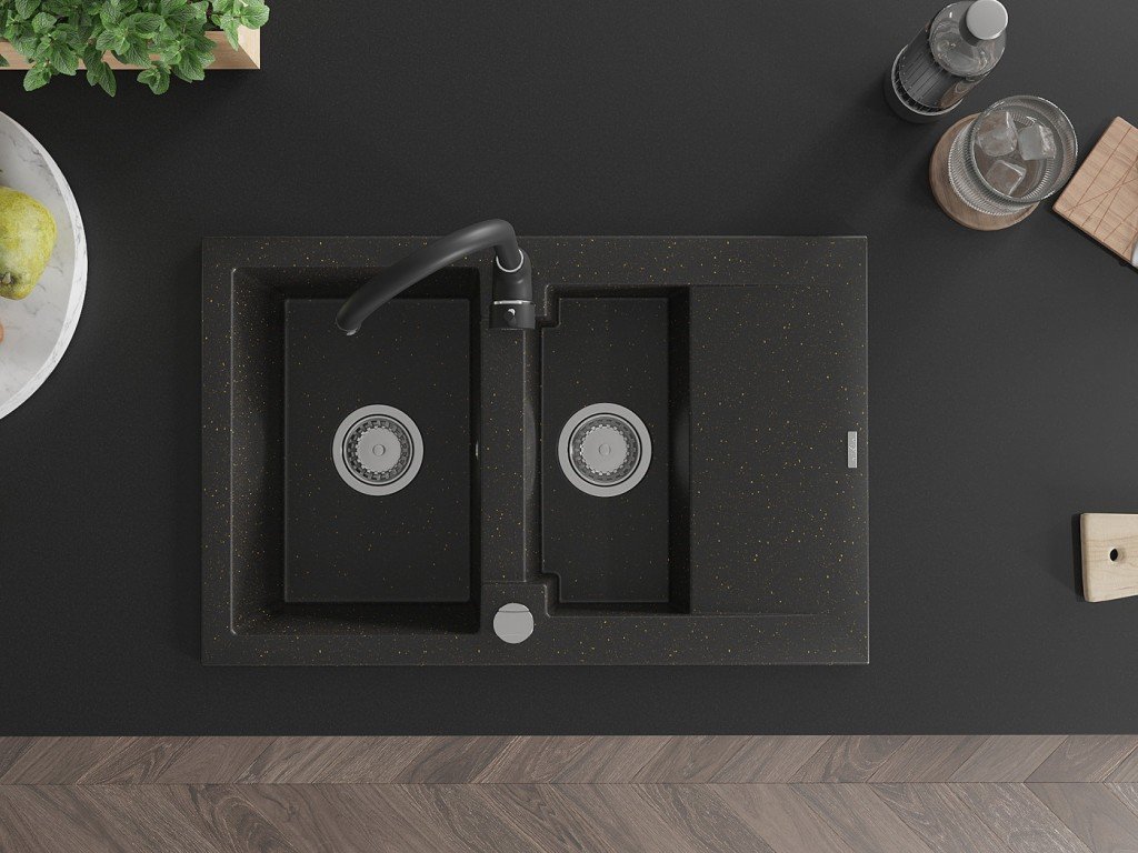 MEXEN/S - Gaspar granitový dřez 1.5 s odkapávačem včetně baterie Telma, černá/zlatý 6507-75-670200-70