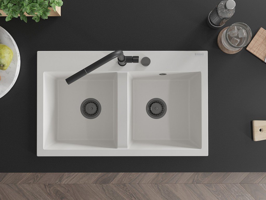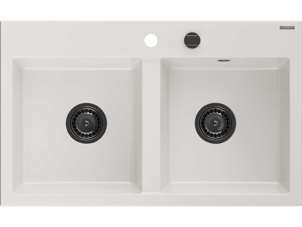 MEXEN/S - Hektor granitový dřez 2-bowl 800 x 480 mm, bílá, černý sifon 6521802000-20-B