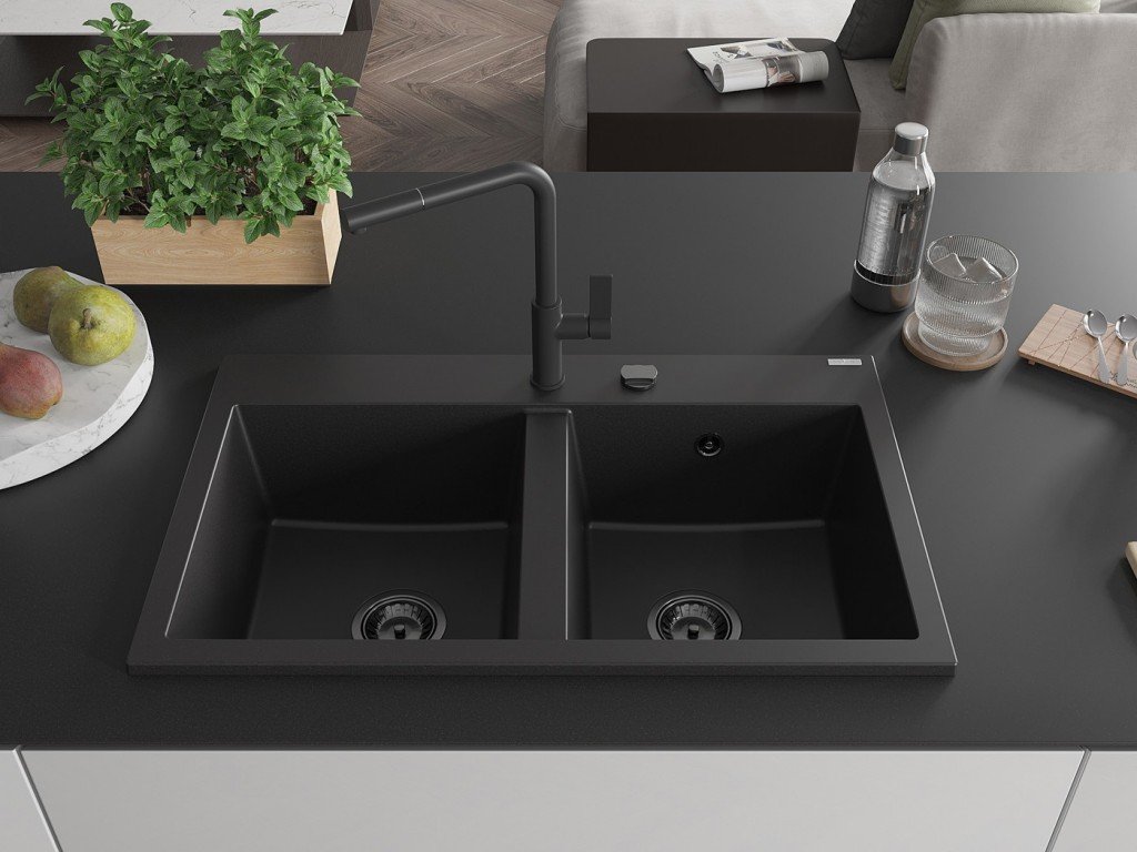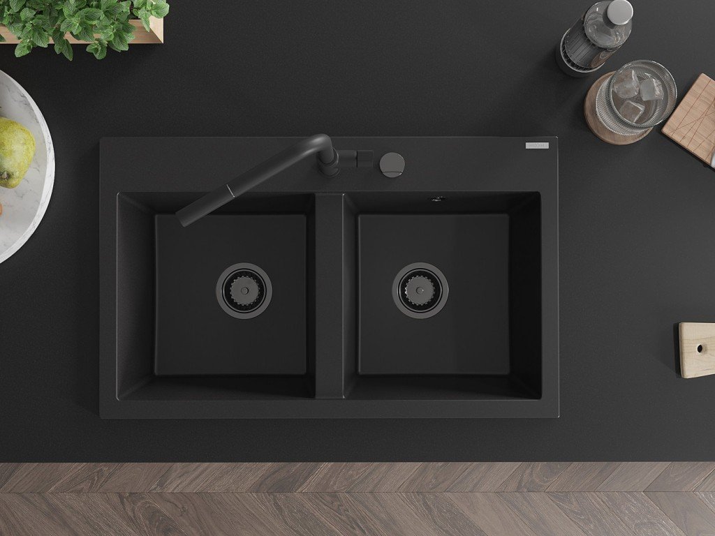 MEXEN/S - Hektor granitový dřez 2-bowl 800 x 480 mm, černá, černý sifon 6521802000-77-B