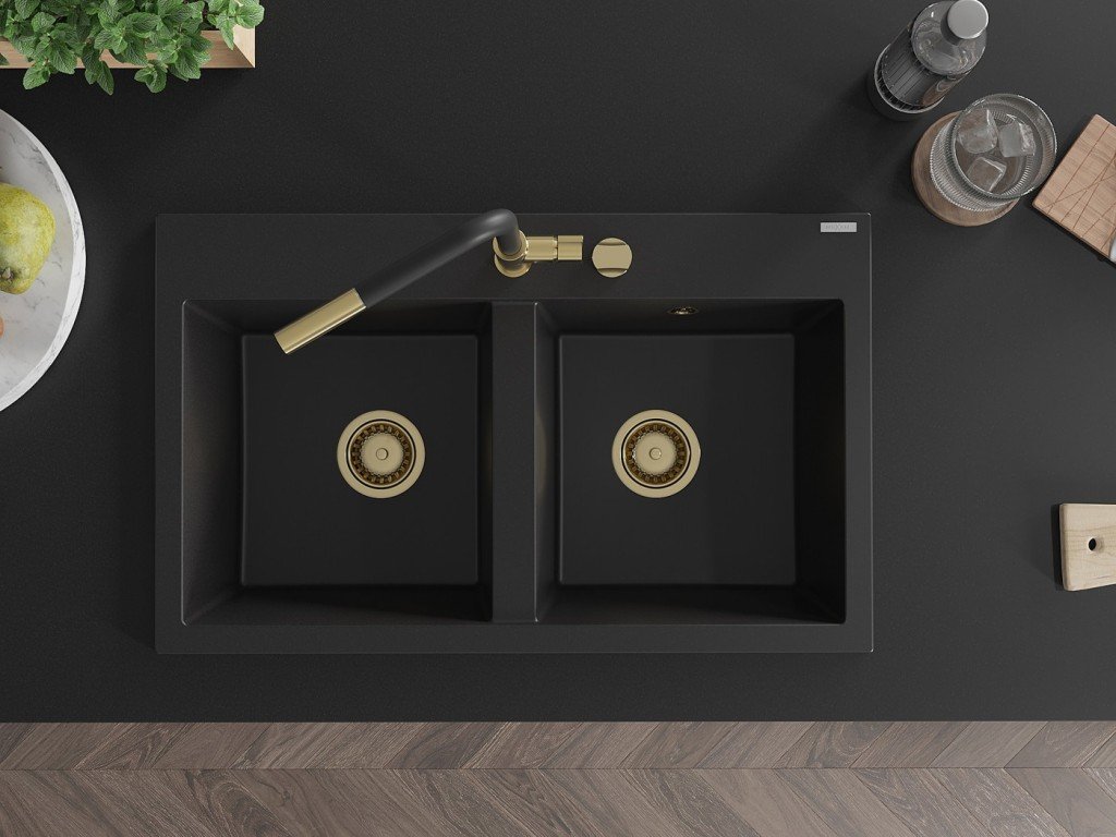 MEXEN/S - Hektor granitový dřez 2-bowl 800 x 480 mm, černá, zlatý sifon 6521802000-77-G