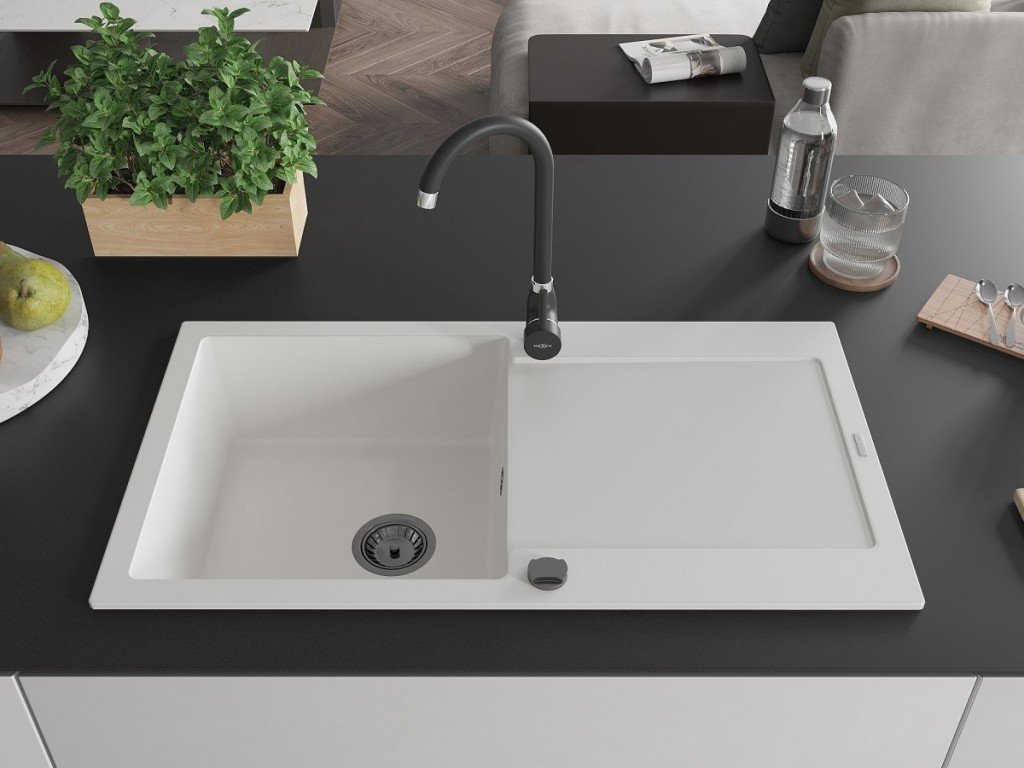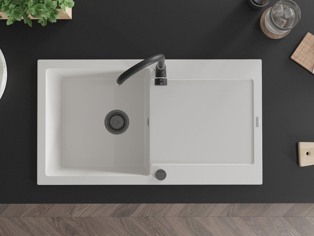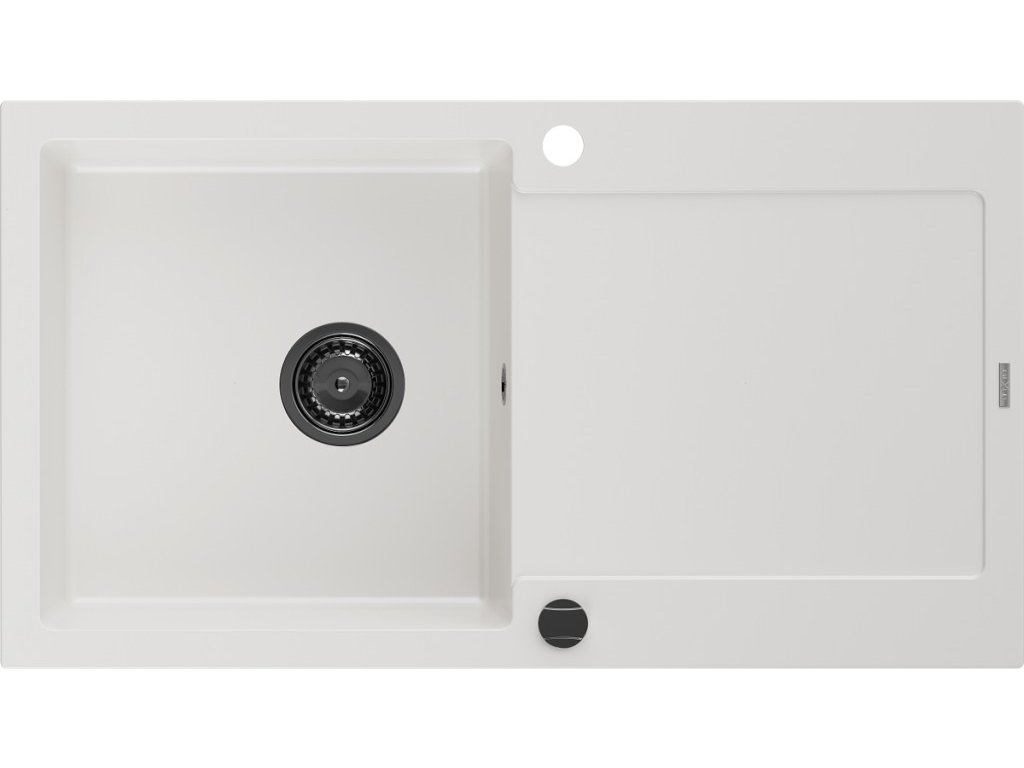 MEXEN/S - Leo granitový dřez 1 s odkapávačem 900x500 mm,bílá,+ černý sifon 6501901010-20-B