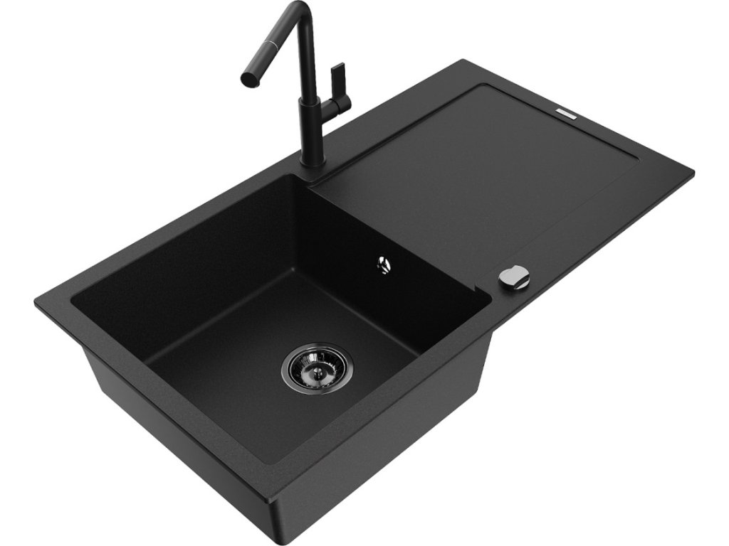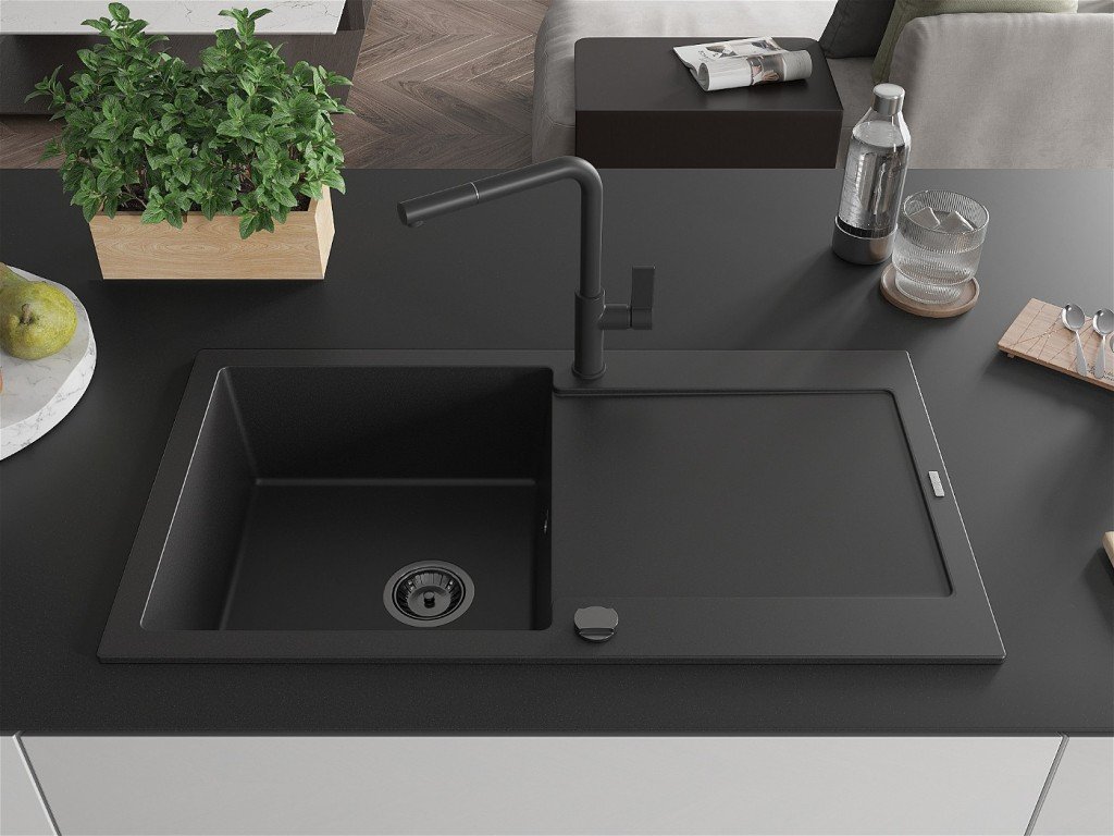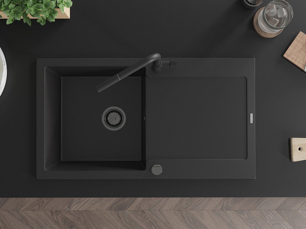 Dřezová vodovodní baterie ULTIMA U-50 která je celá v moderní černé - růžově zlaté barvě s vysokým flexibilním masivním ramenem, které je ve růžově zlaté barvě, s hadicí a...