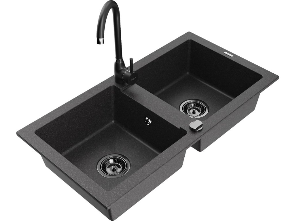 MEXEN/S - Mario granitový dřez 2-bowl včetně baterie Telma, černá kropenatá 6504-76-670200-70-B