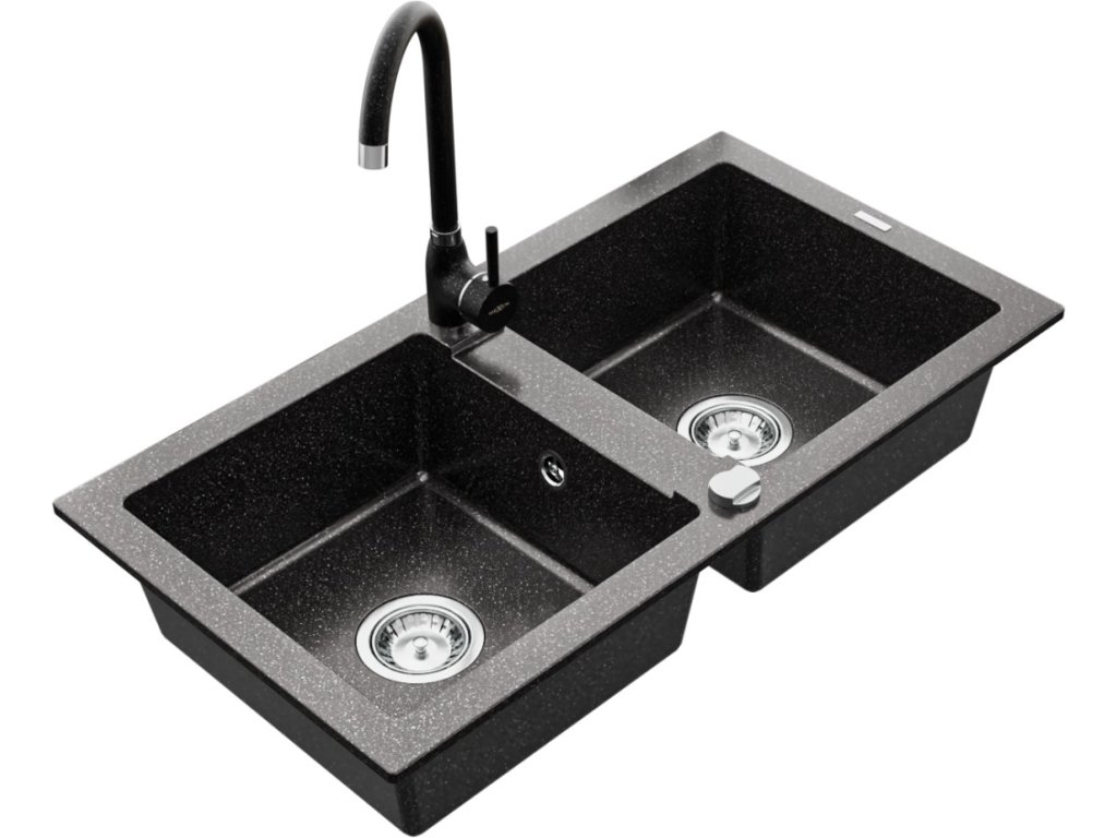 MEXEN/S - Mario granitový dřez 2-bowl včetně baterie Telma, černá kropenatý 6504-76-670200-76