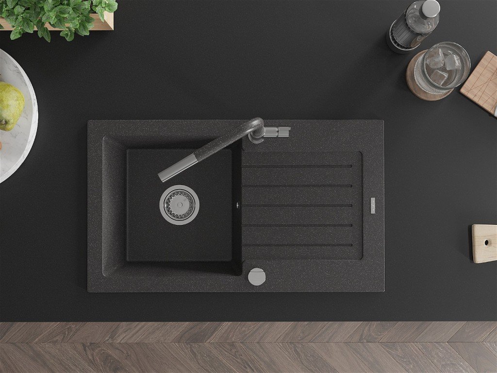 Granitový vestavný dřez s odkapem 77x44 cm v černé barvě kombinuje moderní design a vysokou odolnost. Vyroben z kvalitního granitového kompozitu, který odolává poškrábání,...