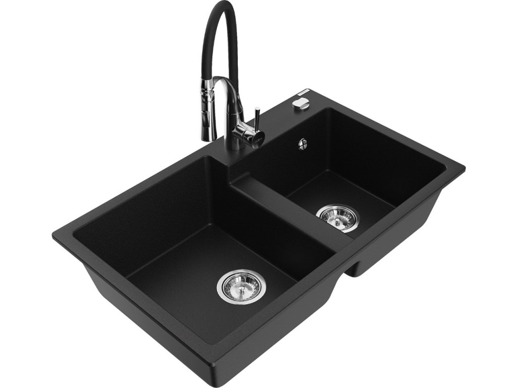 MEXEN/S - Tomas granitový dřez 2-bowl včetně baterie Aster, černá 6516-77-73450-07
